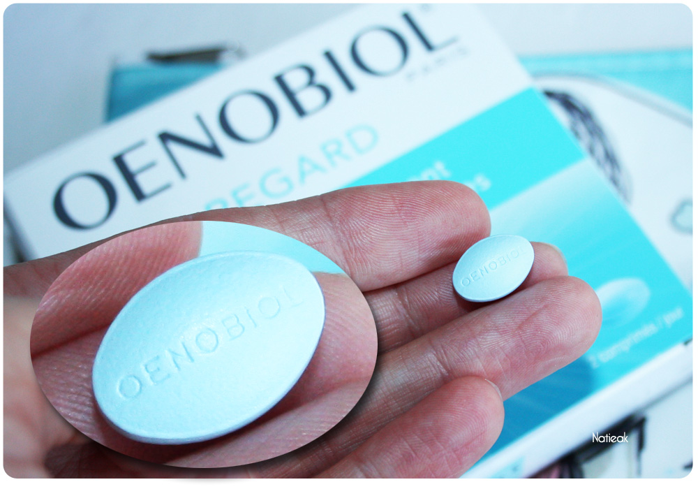 La boîte contient deux plaques de 15 capsules chacune soit 15 jours de traitement puisque l’on doit prendre deux capsules par jour.  Il n’est pas spécifié à quel moment on doit les prendre (à jeun, pendant le repas…? ) ni comment (on avale, on croque…). Sur chaque capsule d’un bleu pastel, on peut lire l’inscription Oenobiol gravée sur une face. Ces capsules n’ont pas d’odeur particulière.
