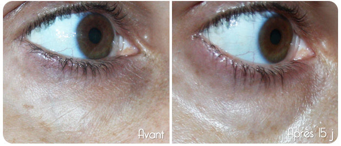 J’ai pris une photo en début de traitement et une autre 15 jours après, afin de pouvoir objectivement comparer les clichés et le cas échéant, acheter une deuxième boîte. Malheureusement, même si j’ai peu de poches, je n’ai vu strictement aucun résultat. J’ai exactement le même contour des yeux qu’avant le traitement ( j’ai même l’air d’en avoir plus sur la photo à J15 !). La formule censée agir dessus n’a pas eu le moindre effet et pourtant, elle n’avait pas beaucoup de boulot avec moi. J’imagine que je dois faire partie des 4% des consommateurs n’ayant pas constatés de résultat.
