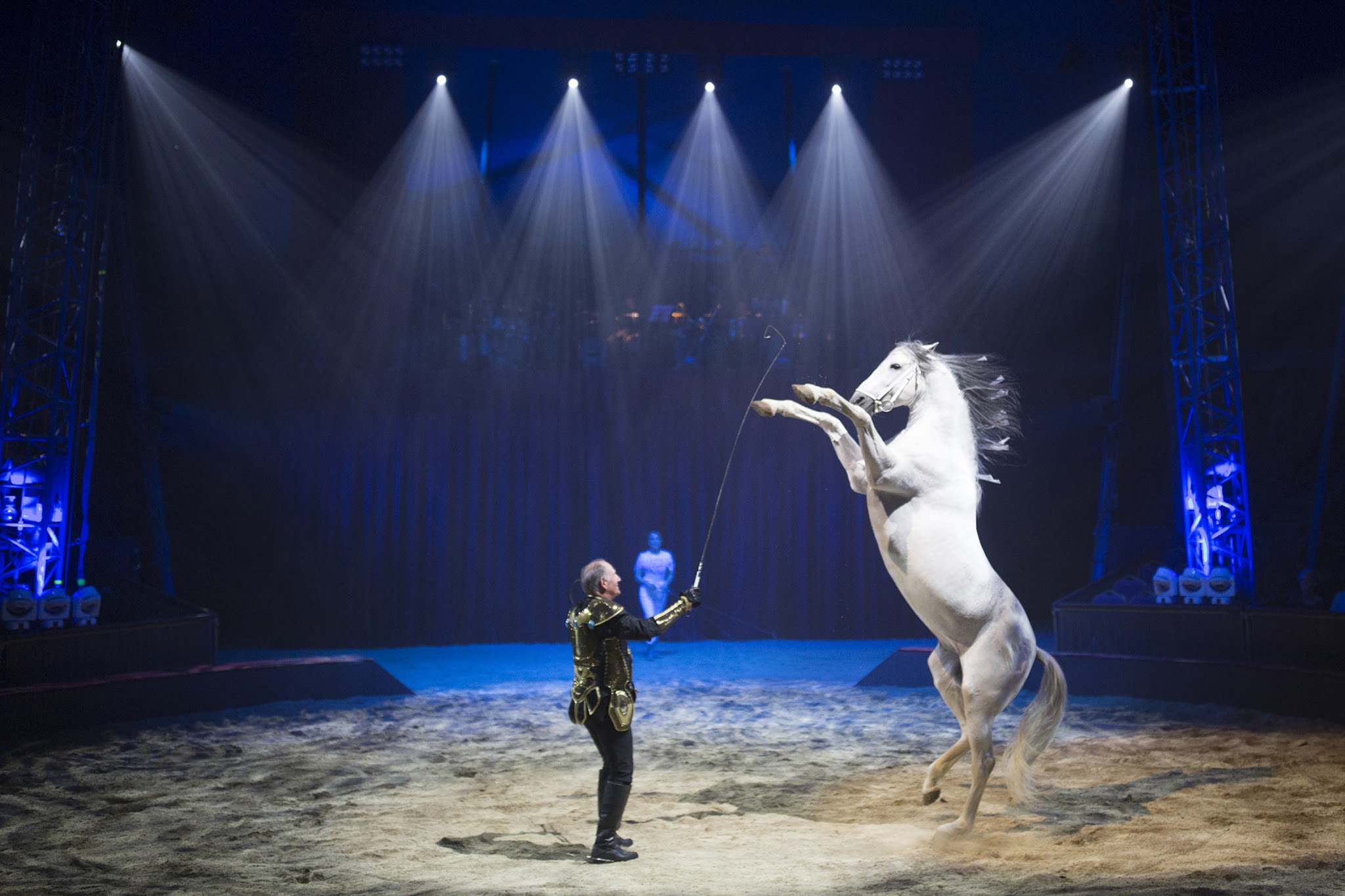 La particularité de ce nouveau spectacle réside par le fait que les artistes évoluent aussi bien sur piste, dans les airs mais également sur une scène amovible. D’ailleurs cette structure métallique presque aussi grande que la piste peut, selon les besoins de la performance, être élevé jusqu’au chapiteau. C’est assurément une belle prouesse technique. Cette diversité permet ainsi une mise en scène assez variée et dynamique grâce à l’intervention des artistes du milieu équestre et de l’art du cirque, et pour le milieu musical, de l’orchestre live et de la chanteuse.