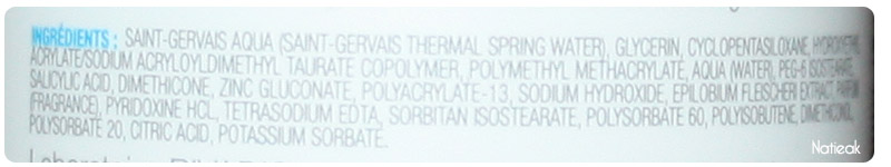 En premier de l’eau thermale Mont Blanc à hauteur de 78 % puis de la glycérine, en 3eme position, du silicone puis un émulsifiant suivi d’un agent filmogène puis un PEG, un parfum et en 8eme position, une forme de vitamine B6.