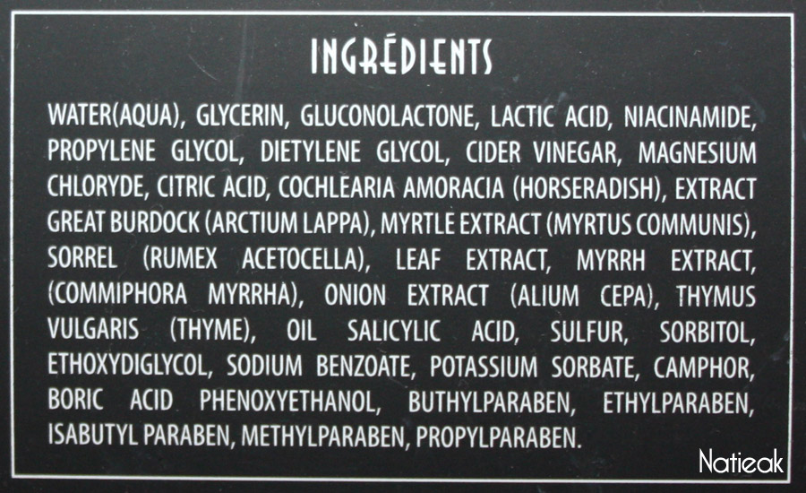 J’ai été assez surprise par l’odeur de cette lotion car elle a un côté vinaigré. C’est comme tout, on finit par s’en incommoder, mais c’est loin d’être hyper glamour comme senteur. Du fait de son action oxygénante, la marque nous informe qu’on peut ressentir des picotements et constater des rougeurs. On évitera donc de l’appliquer sur des peaux irritées.