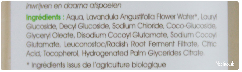 Les huit premiers ingrédients sont les plus importants car plus concentrés : en premier de l’eau, eau de fleur de Lavande bio, un tension actif, un tensio-actif de sucre. En 5eme position, du sel, tensio- actif de sucre doux, un substance de soin de peau, et enfin un tensio actif très doux.