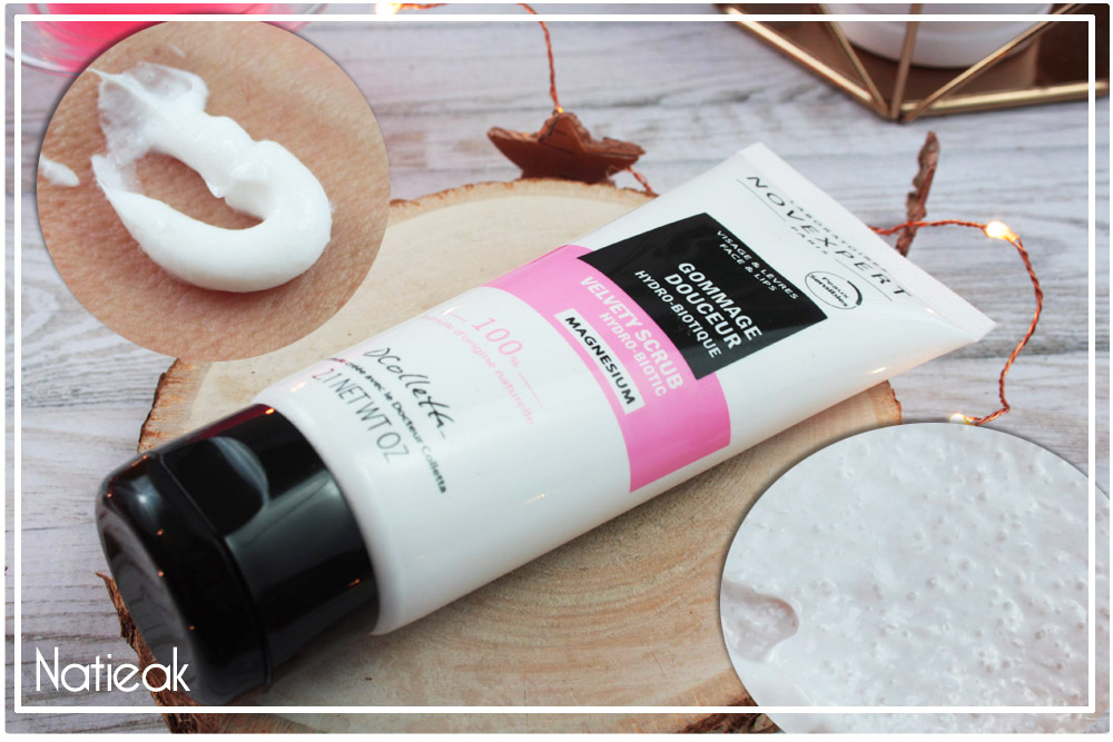 Tout comme la crème douceur, ce gommage douceur de Novexpert fait parti de la gamme Magnésium. Il se présente dans un tube de 60 ml avec un capuchon à vis. Il peut être utilisé sur le visage mais également sur les lèvres.