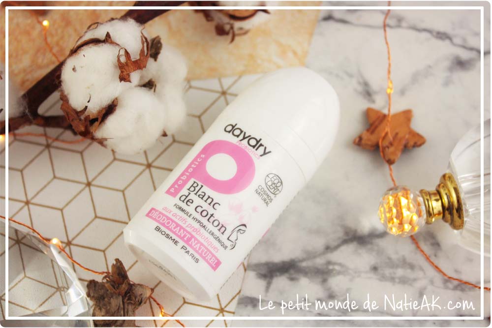 - EDIT ⇒Porte à présent le nom de Déodorant Probiotique Blanc de coton sous le nom de Biosme (et il est rechargeable). Comme on le voit, le laboratoire a mis en avant son nom, la gamme Daydry ayant été finalement arrêté.