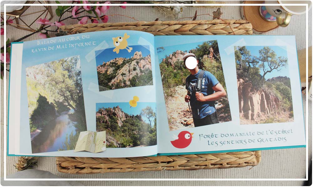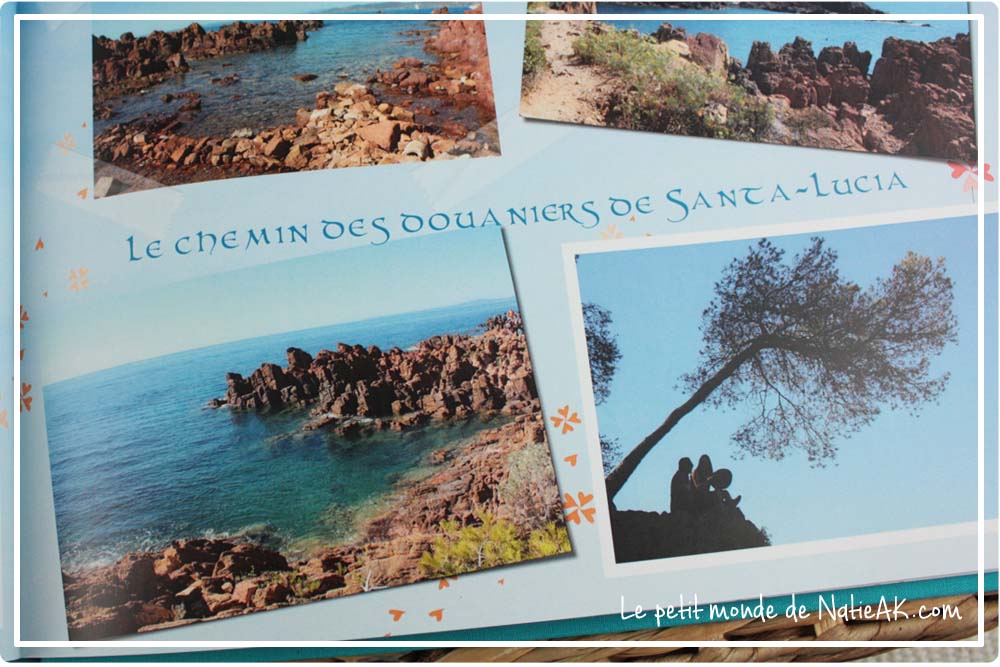 Le fait que l’on puisse agrémenter le fond avec différentes décorations permet d’offrir une diversité d’une page à l’autre tout en gardant une certaine logique puisque j’ai conservé le même fond pour tout le livre photo. Je dois dire que je suis très satisfaite de ma création ! Ainsi, nous avons pu nous remémorer notre merveilleuse promenade le long du chemin des douaniers de Santa Lucia que je vous avais partagée en 2016.