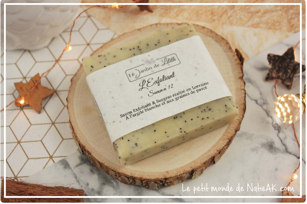 ↪ Ce savon exfoliant est vendu à 6,30 € les 100 gr sur le site Le jardin de Lilith.