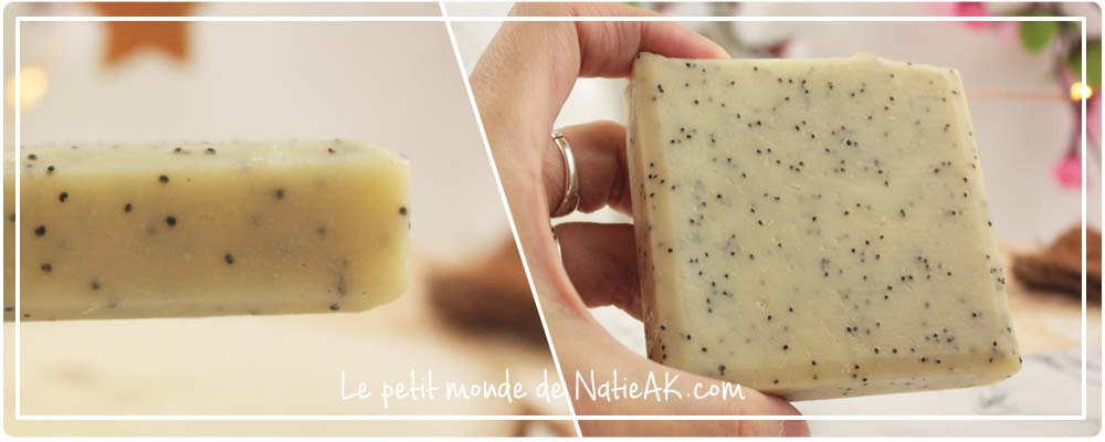 Au fur et à mesure de son utilisation, les graines de pavot sont un peu plus présentes, mais tout en continuant à proposer une action exfoliante tout en délicatesse, mais je précise que je n’ai pas une peau sensible. En terme de sensorialité, je m’attendais à quelque chose de plus présent, mais cela est finalement très discret, quasi neutre. Ceci étant, c’est un soin si qualitatif et si efficace – du fait de la douceur et son pouvoir hydratant – que cela rend ce savon surgras exfoliant très plaisant à l’usage.