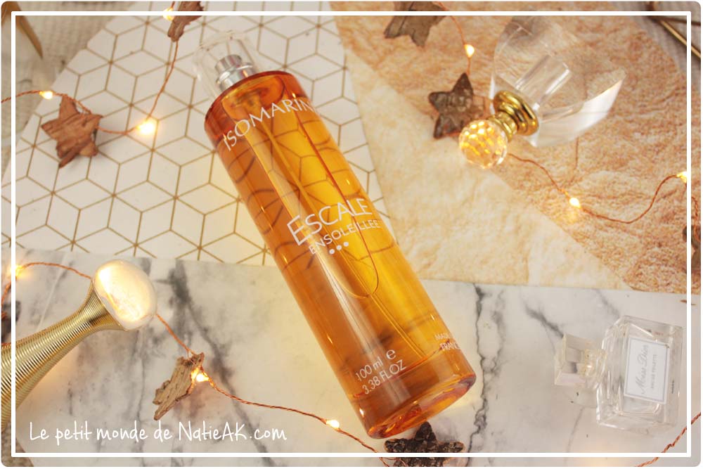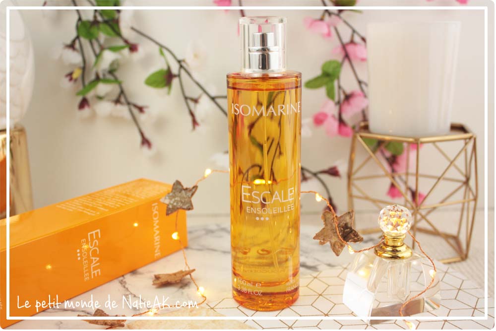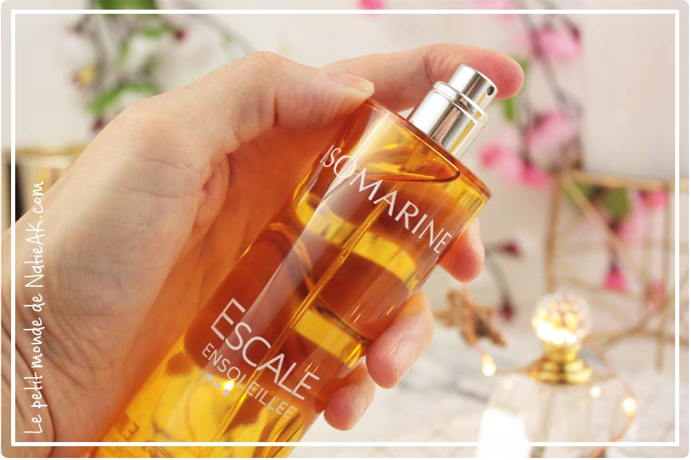 Escale ensoleillée d’Isomarine est une eau qui porte merveilleusement bien son nom. Elle est tout simplement mon coup de cœur parmi mes dernières découvertes. Non seulement elle nous transporte au cœur de l’été grâce à ses notes ultra vitaminées qui rappelle la belle saison, mais elle apporte en plus des bienfaits à la peau ! En effet, Isomarine a intégré des actifs visant à préserver la fermeté de la peau grâce à l’extrait de criste marin, des agents hydratants via la glycérine, des propriétés détoxifiante grâce à l’extrait de Fucus vesiculosus et une action anti radicalaire et régénérante grâce à l’Immortelle des Mers, une plante de bord de mer. Notons que cette eau ne contient aucune substance photosensibilisante.