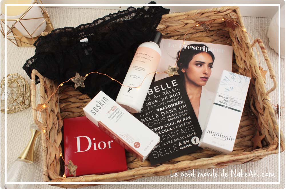 La box de la rentrée nous propose exceptionnellement trois produits tous en format vente : gel douche Câlin fleur d’oranger et Calendula de Prescription Lab, un soin hydratant hydrawear de Soskin, un gommage des vagues d’Algologie, le tout présenté dans un joli pochon saumoné. À cela, s’ajoute une culotte en dentelle de la marque Noo ainsi que de quatre échantillons Dior de rouges à lèvres naturels Rouge Dior ultra care infusés d’huiles florales.