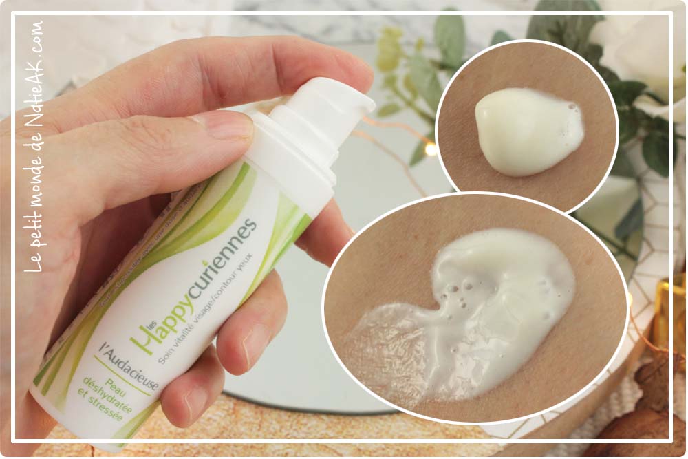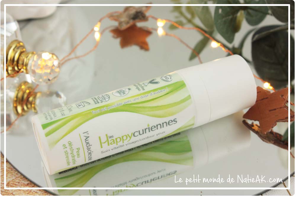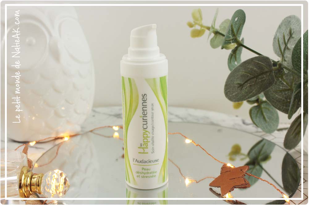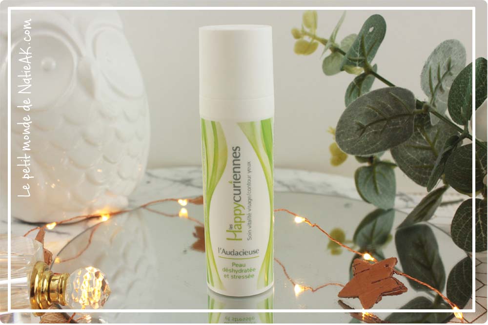 Cette crème L’audacieuse de Les Happycuriennes est un soin vitalité destiné au visage déshydraté (dû à un manque d’eau occasionné par l’environnement ou nos habitudes de vie) et stressé et au contour des yeux. Pour redonner de l’éclat et une bonne mine au peau fatiguée et la régénérer, tonifier et nourrir, la marque a intégré de l’eau florale de passiflore bio (vertus anti stress, apaisante et anti oxydante), Huile de tournesol bio (antioxydant grâce à la vitamine E, régénérante et protectrice), huile de chanvre bio (protectrice, apaisante et régénérante) ou de noix de coco encore de l’extrait d’Immortelle bio et d’extrait de pin maritime.