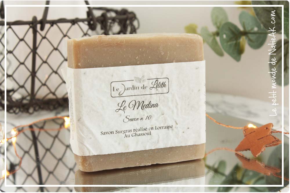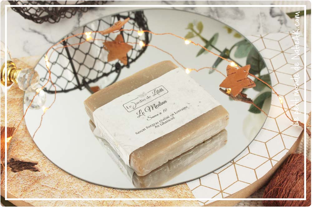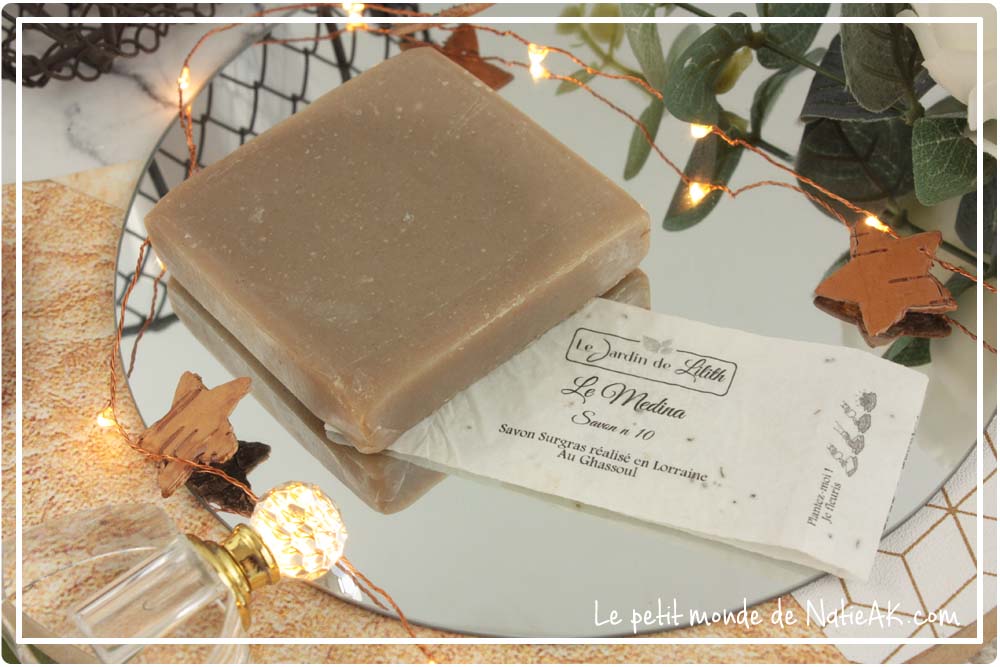 ↪ Ce savon surgras nommé Le Medina n°10 est vendu à 6 € les 100 gr sur le site Le jardin de Lilith.