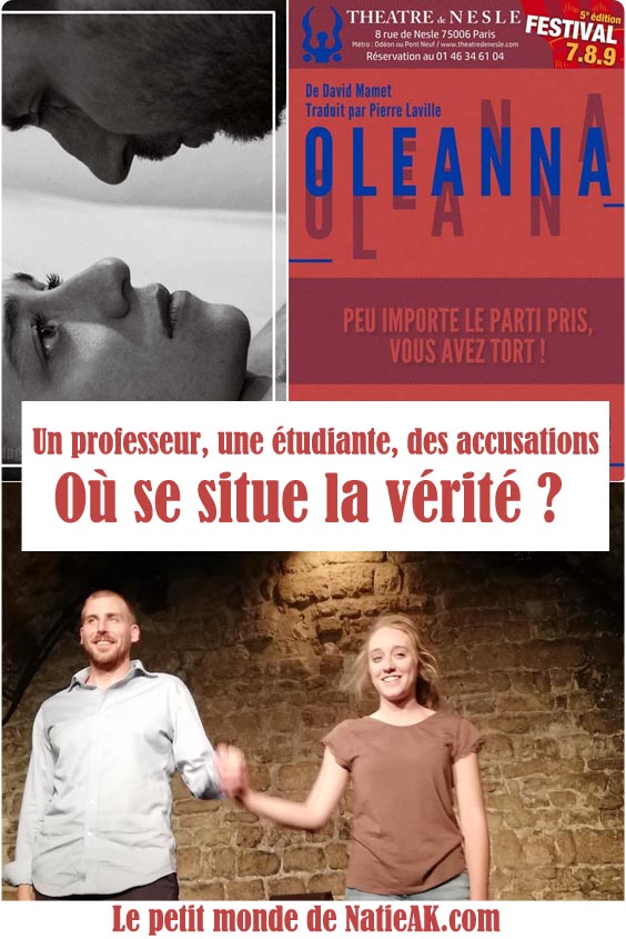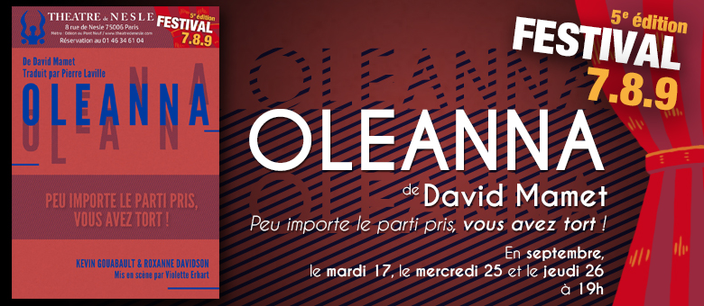 Oléanna est une pièce contemporaine programmée le 17, 25 et 26 septembre 2019 à 19h au Théâtre Nesle durant le Festival 7.8.9. Le Festival propose également pour sa 5eme édition 35 spectacles en 25 jours regroupant aussi bien des pièces de comédie, mime, improvisation, humour, musique et même des pièces dramatiques.
