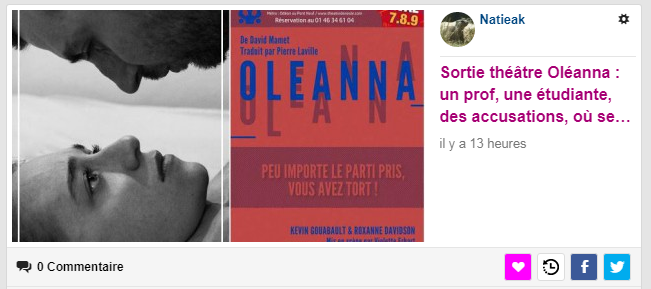Très sympa cette pièce, je viens justement de me mettre aux cours de théâtre que j'adore. Dommage que c'est un peu loin pour moi, j'aurais bien aimé la voir.