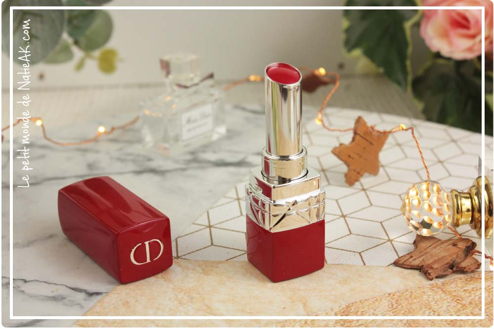 Rouge Dior ultra rouge a la spécificité d’être un rouge à lèvres concentré en pigments, qui promet une tenue de 12 heures et une sensation confortable. En effet, son pouvoir hydratant permet aux lèvres de ne pas les assécher, puisqu’il contient de l’huile de jojoba, un bon hydratant.