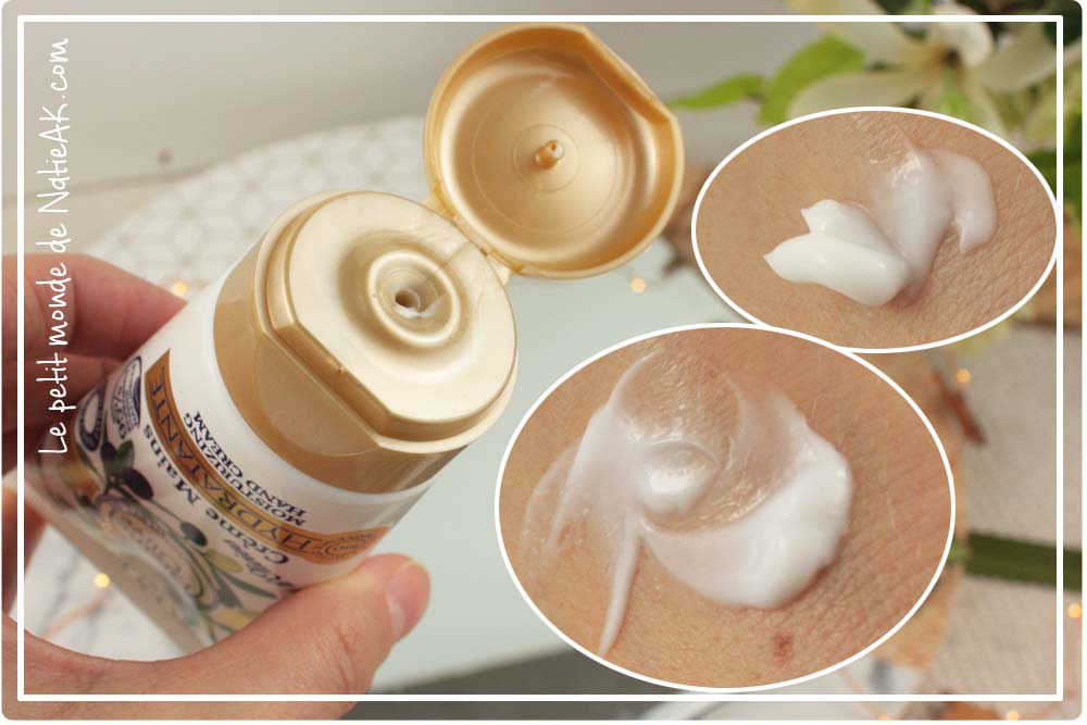 Cette crème mains se présente dans un tube souple opaque muni d’un capuchon à clapet. Son format permet une bonne prise en main et la praticité du fermoir une utilisation facile et rapide. Le packaging similaire au lait corporel me plaît toujours autant !