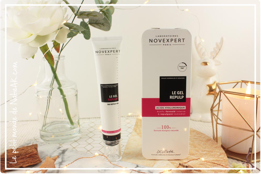 Le gel repulp de Novexpert est destiné à lutter contre les signes du vieillissement en comblant les sillons cutanés du visage pour les peaux normales à mixtes. Afin de retrouver une peau plus ferme et repulpée, la marque a intégré à la tapioca (hydratant), de l’acide hyaluronique (effet tenseur, régénérant et améliore l’hydratation mais aussi élasticité et fermeté à la peau), de l’aloe vera bio (apaisante, regénératrice et protectrice), des extraits d’algues anti-âge, des extraits de commiphora (plante repulpante qui apporte du volume), des actifs anti-âge et apaisant, mais aussi de la vitamine E (antioxydant) et des extraits d’algue booster de collagène et d’acide hyaluronique).