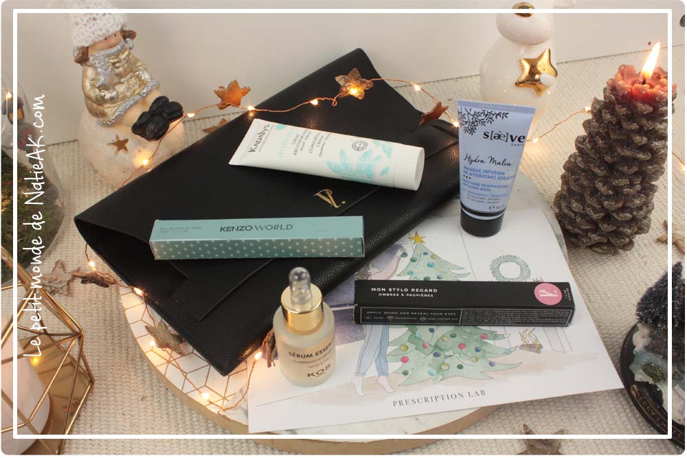 En ce mois de décembre, Prescription lab nous propose un sérum réparateur et nourrissant Kos Paris, une crème visage Kadalys et un masque visage Saeve (format voyage). Elle contint également un stylo fard à paupière Prescription Lab, un parfum échantillon Kenzo World et une pochette de soirée en similicuir.