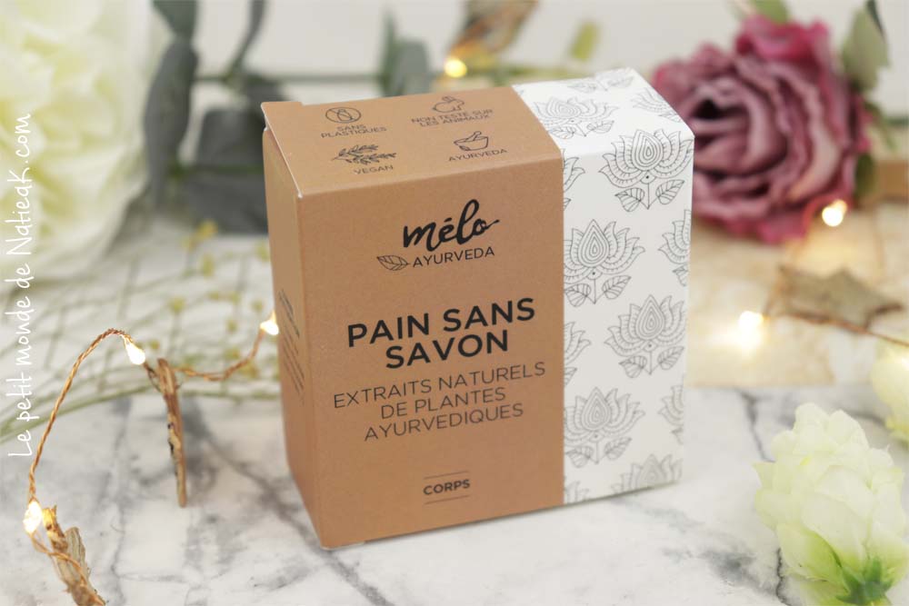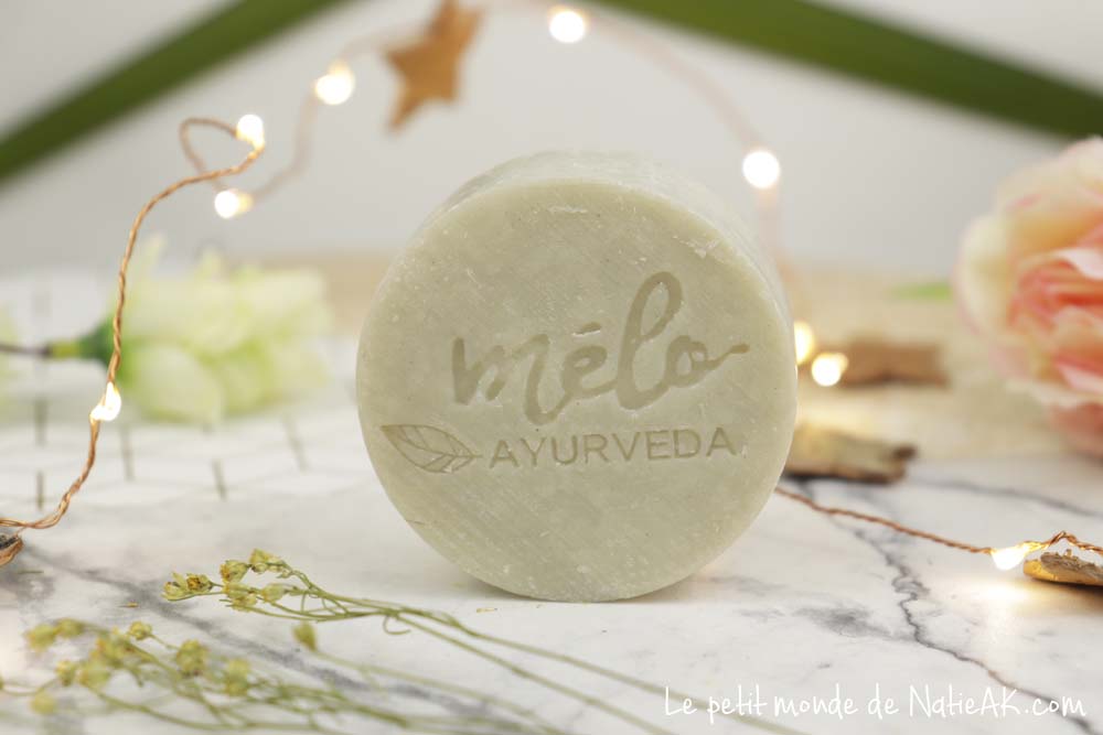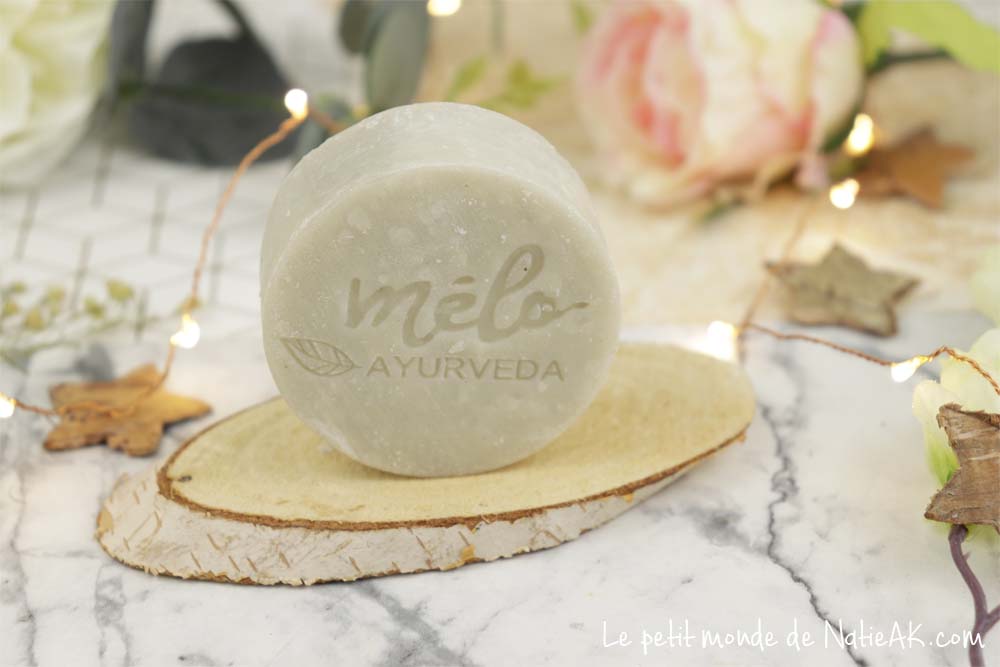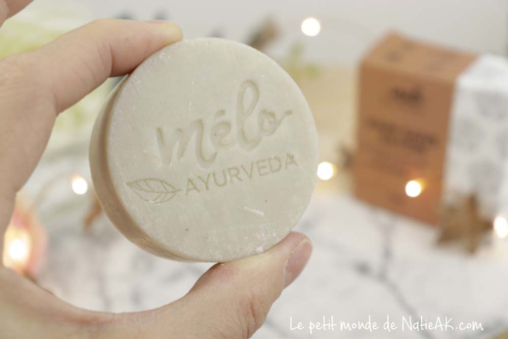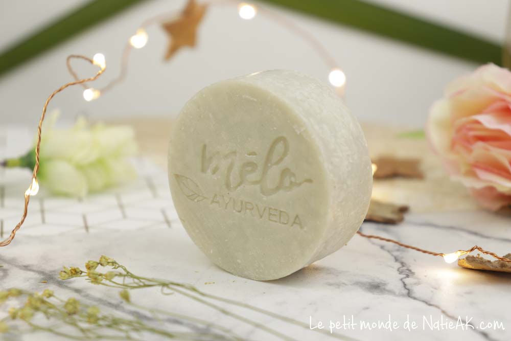 Ce pain sans savon de Mélo Ayurveda est destiné à apaiser et hydrater les peaux dont les peaux sensibles. Afin d’éviter tout dessèchement cutané, la marque a exclus le savon et a formulé ce soin en ingrédients naturels, capables d’hydrater grâce à l’huile de coco, de la poudre ayurvédique de neem (purifiant, assainit, régule le sébum et élimine les toxines) et de la poudre de fruits de Shikakai (plante ayurvédique aux bienfaits nettoyantes, apporte également de la douceur  aux cheveux tout en favorisant leur pousse et en réduisant les pellicules).