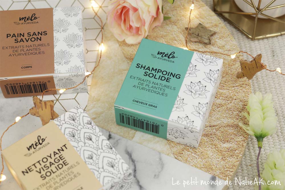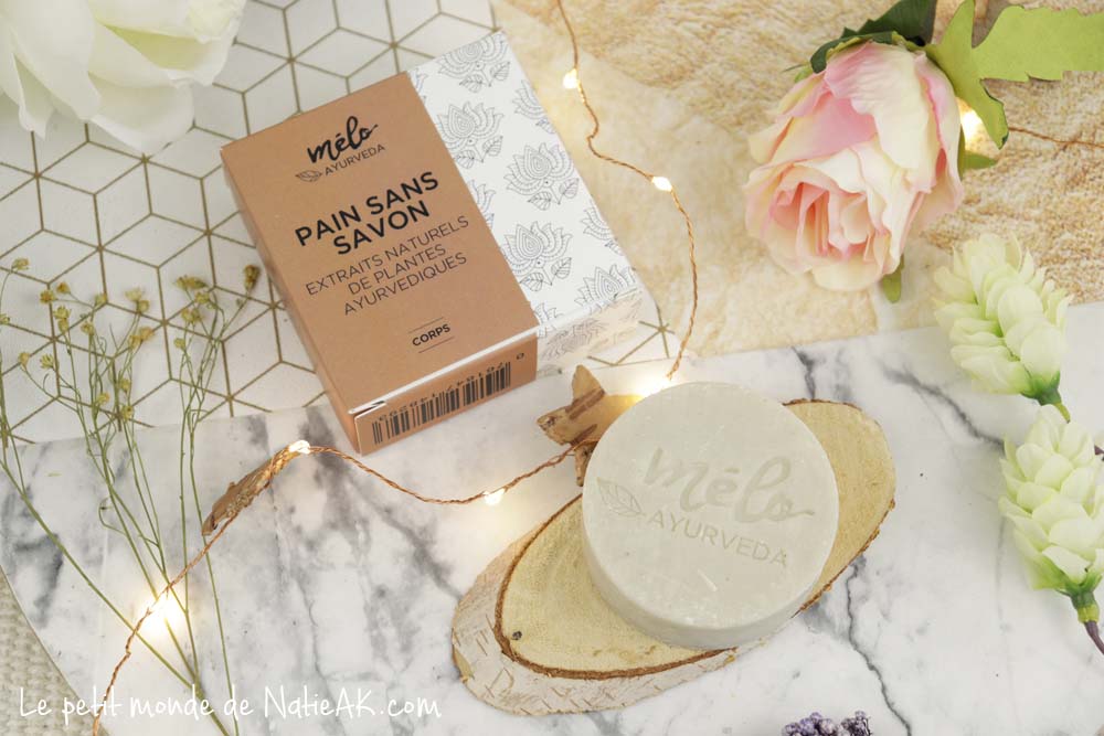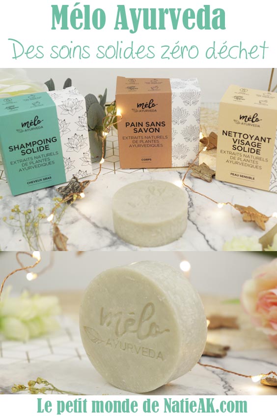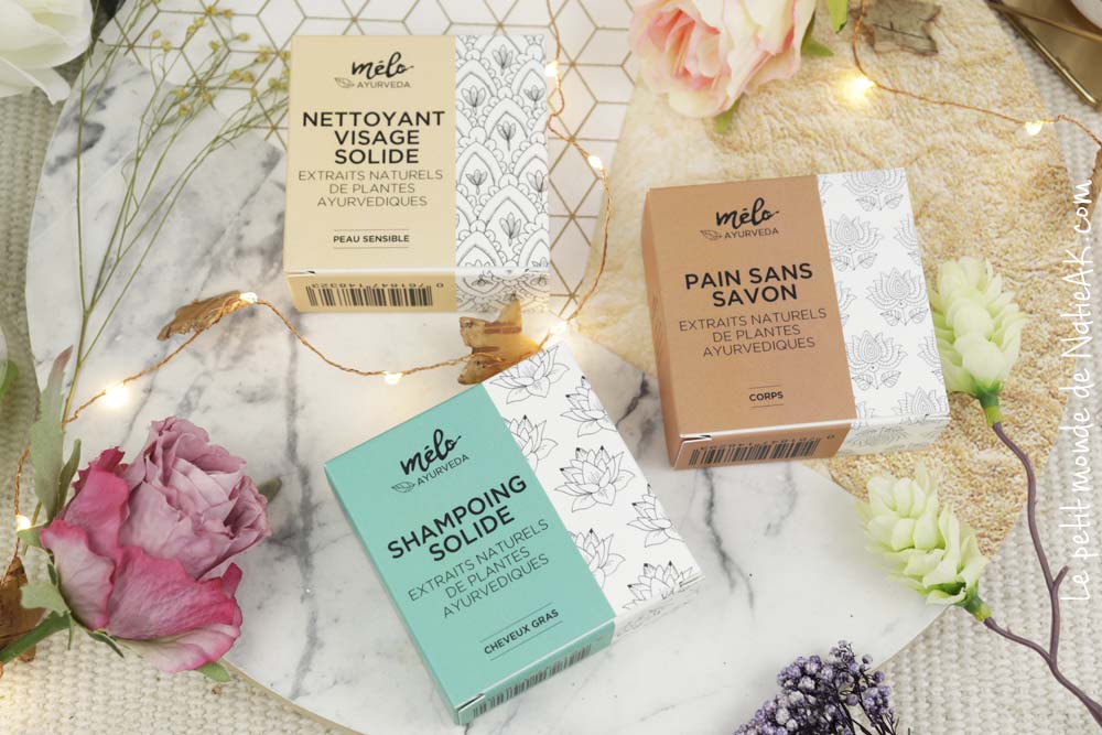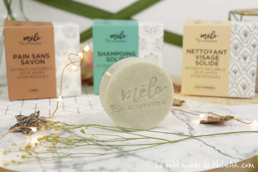 ↪ Leur démarche correspondant à mes envies, j’ai été ravie lorsque Mélo Ayurveda m’a proposé de tester leurs soins. C’est ainsi que j’ai opté pour un Pain sans savon corps, un nettoyant visage et démaquillant peau sensible et pour ma fille un shampoing solide pour cheveux gras, le tout en format solide et composés d’extraits naturels de plantes ayurvédiques.