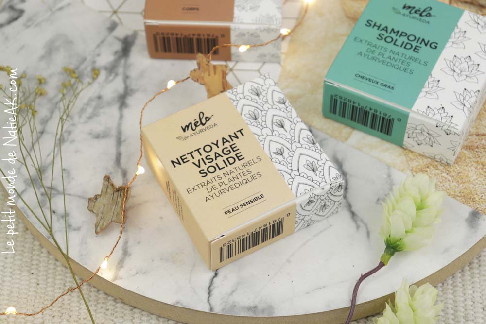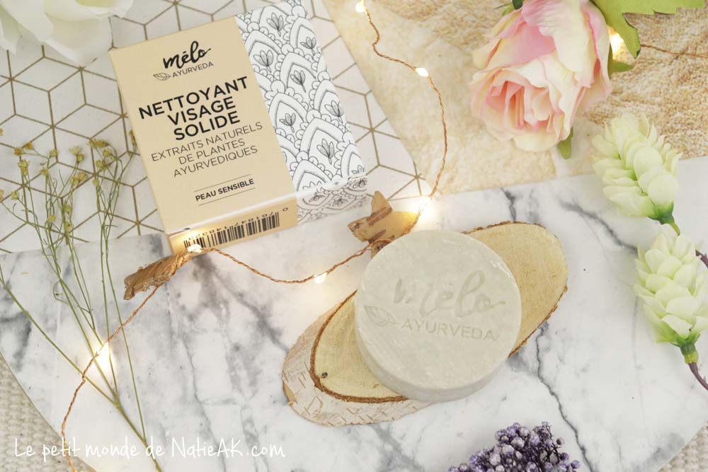 Pour la routine nettoyante/démaquillante, Mélo Ayurveda propose un nettoyant visage et démaquillant solide adapté aux peaux sensibles, capable de démaquiller et d’éliminer les impuretés et les particules (poussière,  pollution…). Pour procéder à un parfait démaquillage et nettoyage tout en hydratant et apaisant la peau, le soin nettoyant contient de la poudre ayurvédique de neem (notamment purifiante, elle assainit, régule le sébum et élimine les toxines), de la noix de coco (excellent démaquillant, antioxidant, nourrissant, réparateur…)