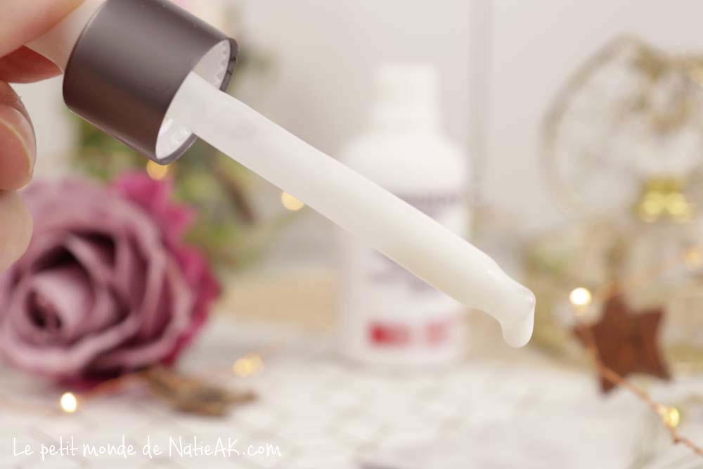 La texture laiteuse d’aspect épais est finalement onctueuse : elle se répend facilement sur la peau permettant de l’appliquer sans difficulté. Par contre, j’en mets un peu plus que la quantité recommandée par la marque : 4 grosses gouttes sur l’ensemble du visage et du cou. Cela est non seulement plus facile à répartir, mais c’est également plus adapté à mes besoins cutanées. J’obtiens ainsi un bon confort de peau immédiat, sans effet collant en plus de bénéficier d’un délicat parfum plutôt féminin. Si vous n’avez pas l’habitue d’appliquer ensuite une crème de soin, ce sérum aura l’avantage de ne pas faire briller votre peau.