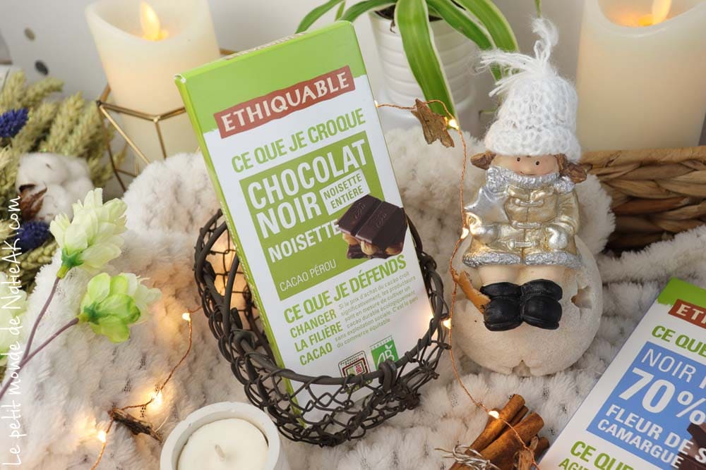 ⇒ Grâce à la diversité des tablettes de chocolat, on pourra offrir un joli panier gourmand : une belle attention qui fera de l’effet sous le sapin de Noël ! Cette année, Ethiquable propose quelques nouveautés en chocolat noir que je m’empresse de vous partager : chocolat noir amande, chocolat noir noisette, chocolat noir café arabica et chocolat noir fleur de sel.
