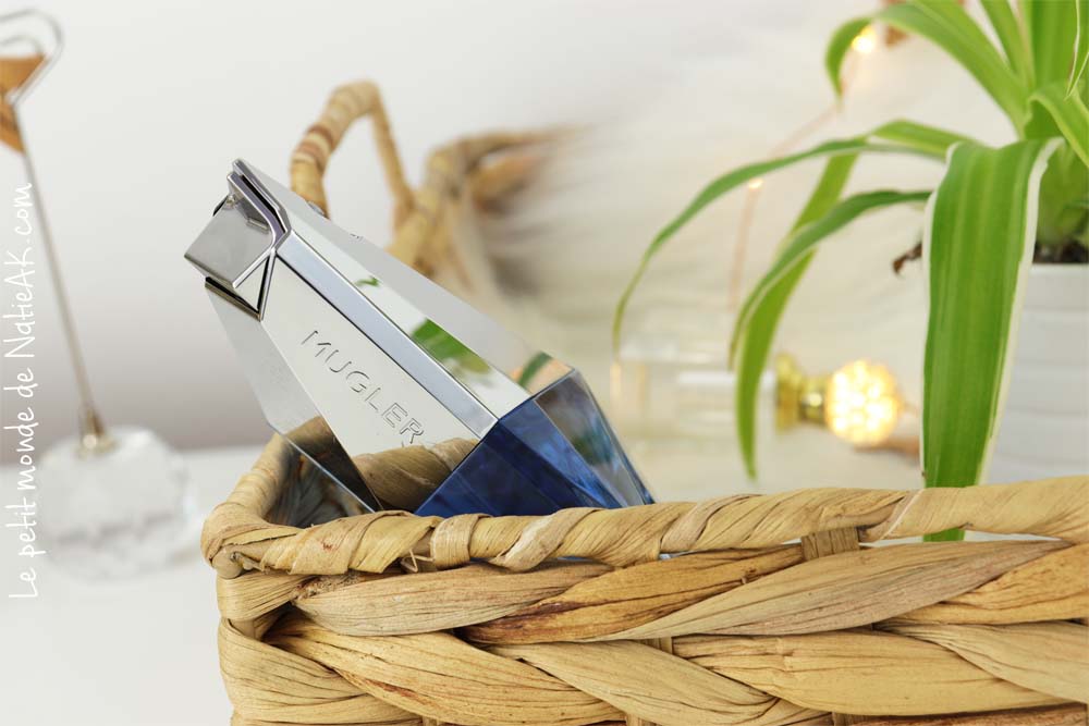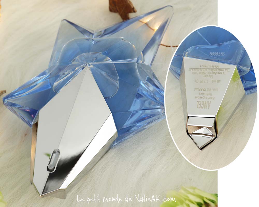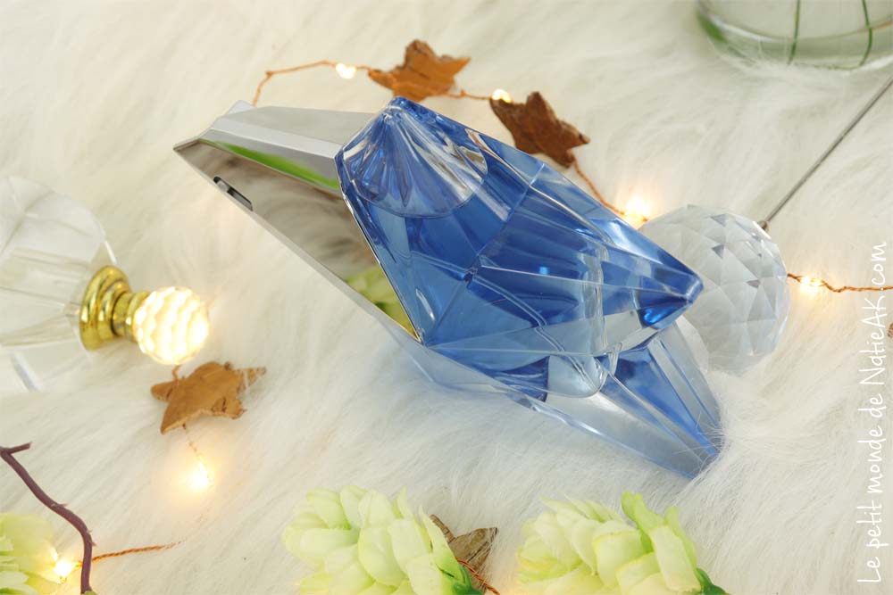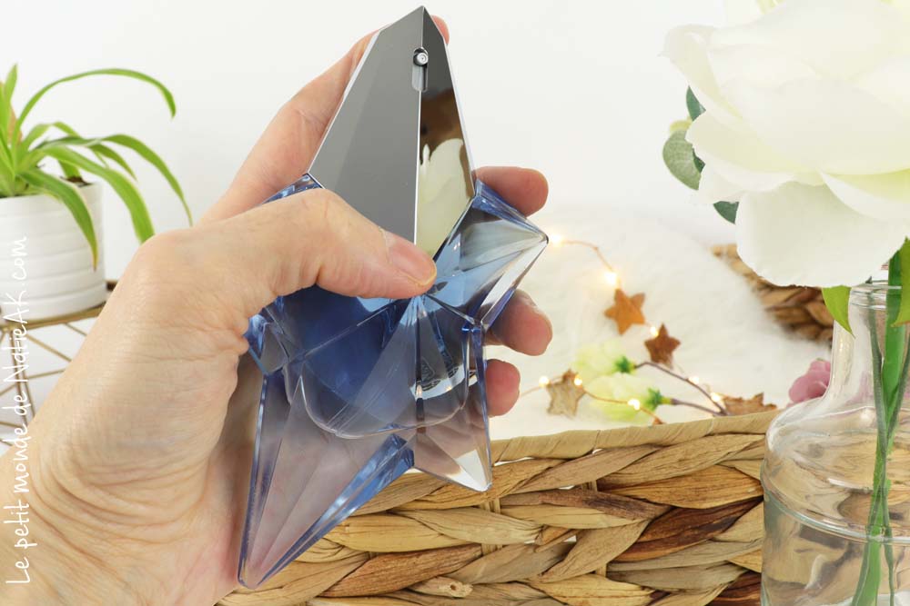 Il est difficile de rester insensible devant cette étoile asymétrique d’un bleu nuit, qui a le mérite de faire entrer le luxe dans une démarche à la fois responsable, économique et écologique. En effet, ce vaporisateur peut être rechargé à la fontaine à parfums Mugler. Depuis, de grandes marques du luxe ont repris ce concept du parfum ressourçable.