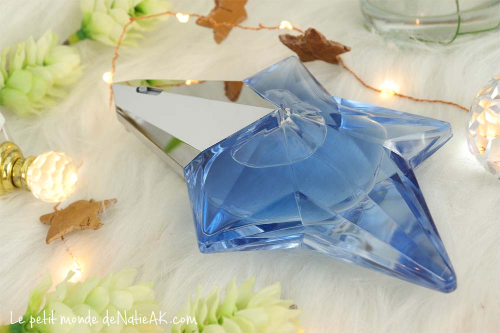Cette eau de parfum Angel se présente dans un flacon en cristal dont la forme reproduit celle d’une étoile à cinq branches. Telle une étoile dans le ciel, l’astre d’un bleu nocturne brille dès qu’elle rencontre la lumière, apportant encore plus de magie à ce petit bijou. Très représentative de l’univers de Thierry Mugler, cette étoile issue de son imagination, deviendra l’emblème de la maison.