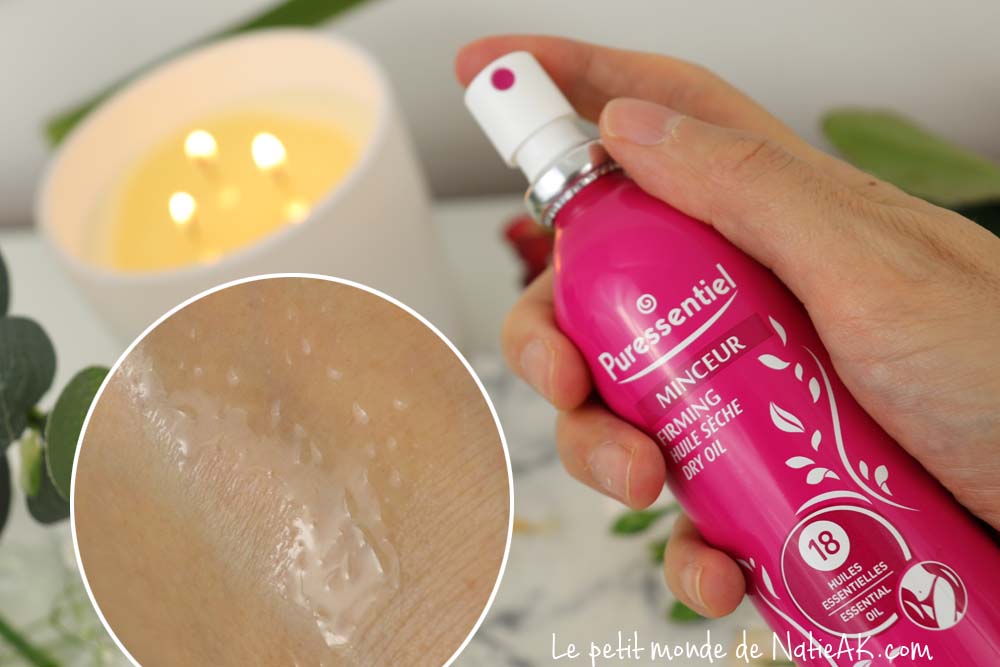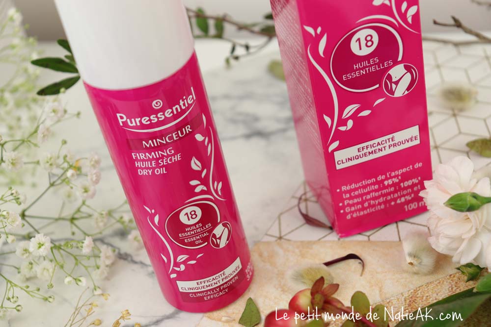 On termine avec la Puressentiel minceur avec l’huile sèche. Elle se compose de 18 huiles essentielles choisies pour leurs vertus raffermissantes, tonifiantes et leurs capacités à améliorer le tissu cutané. Elles sont associées à des huiles végétales nourrissantes dont l’huile de jojoba et de macadamia. Le but étant de diminuer l’effet peau d’orange et d’améliorer l’aspect de la cellulite. Cette graisse stockée sous l’épiderme touche toute les femmes qu’elles soient menues ou plus voluptueuses.