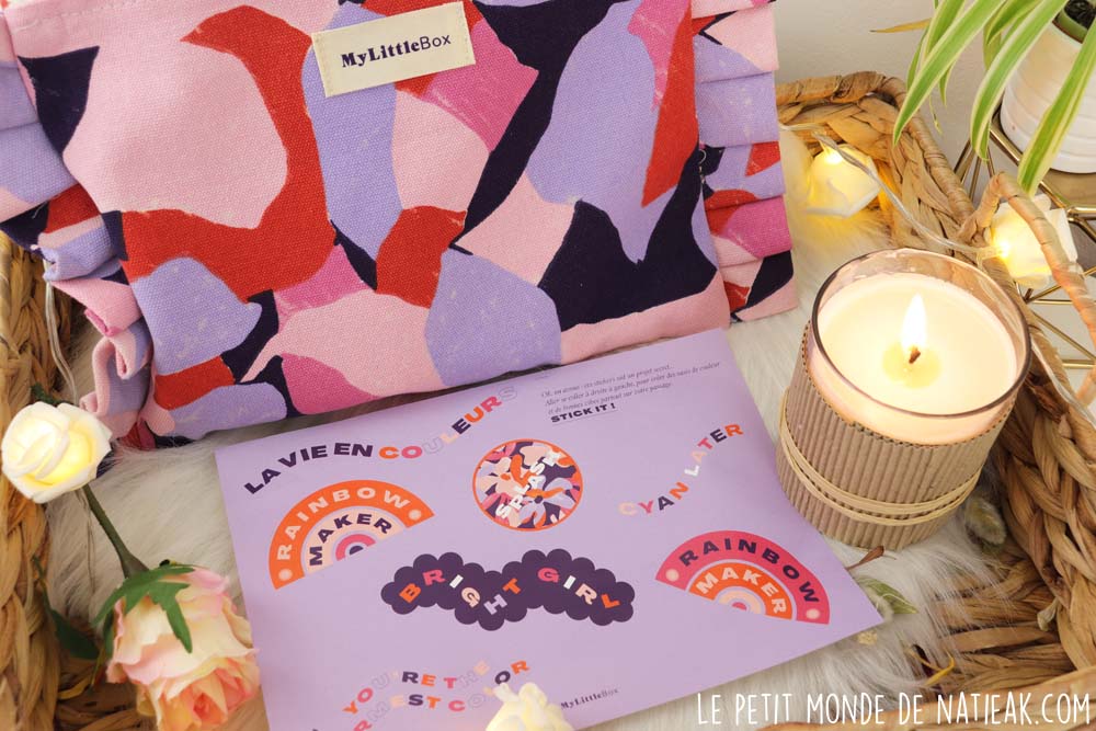 Pour prolonger la positivité et repousser la grisaille d’octobre, une planche de stickers envoient des messages pleins de positivité. On retrouve ces mêmes couleurs sur la pochette et la bougie.