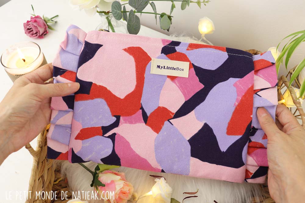 j'adore la pochette, elle est super jolie, tant les motifs, que les couleurs et les froufrous sur les côtés! la bougie c'est une idée super sympa mais les produits me plaisent moins, je préfère avoir des soins que du makeup dans les box mais ça c'est propre à moi car en vrai elle est très intéressante cette box!