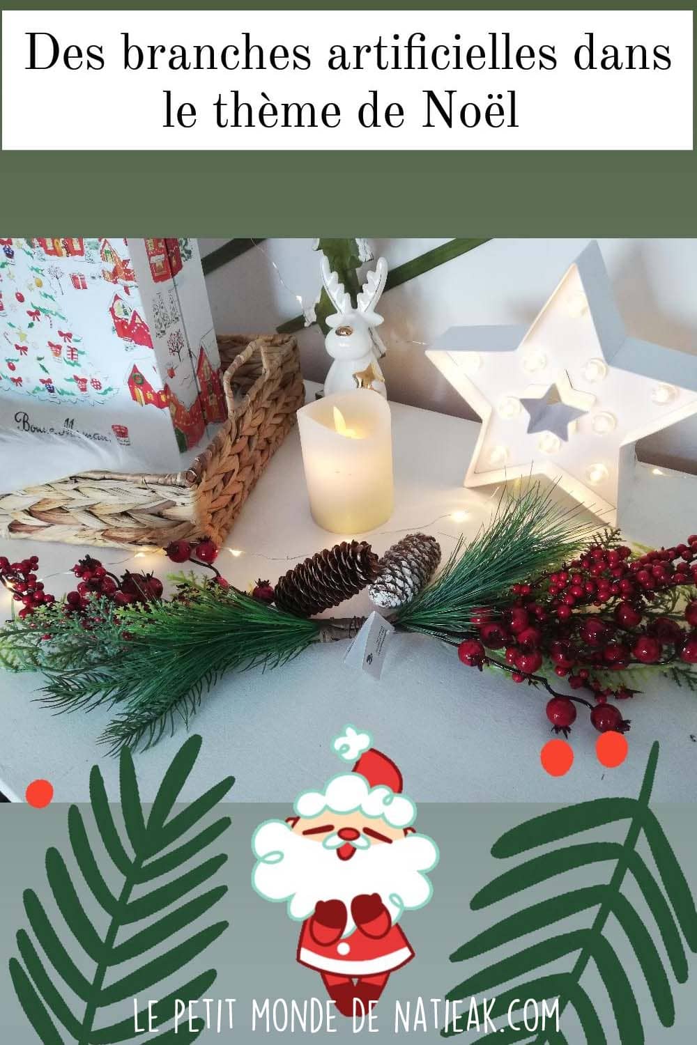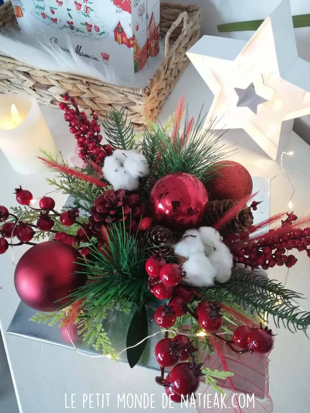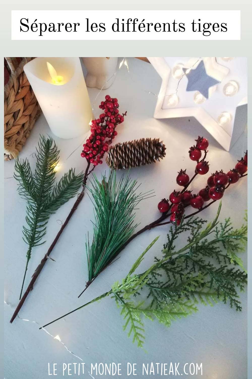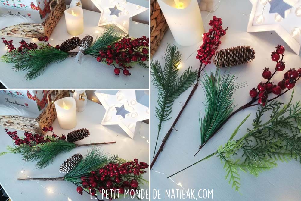 – Pour un rendu plus naturel, on peut ajouter des véritables feuilles de houx, des branches de sapin ou autres plantes d’hiver qui ont une bonne durée de vie. Elles offriront un aspect plus authentique à la végétation artificielle. Comme mes branches offrent une belle harmonie et un effet naturel intéressant, je n’ai pas ajouté de vraies végétations.
