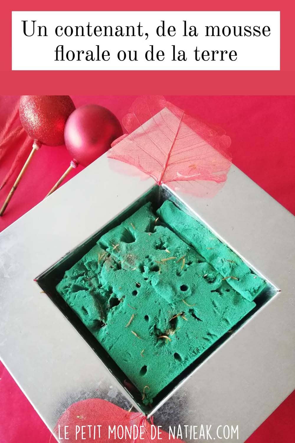 On peut aussi camoufler la mousse florale avec de la mousse végétale séchée (on en trouve au rayon déco de Noël à tout petit prix ou à ramasser en forêt) ou avec de la neige artificielle (il existe des tutoriels sur le net).