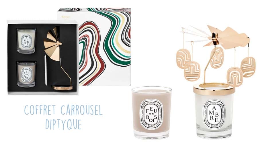 En bougie, la marque de luxe Diptyque spécialisée dans les parfums et bougies parfumées propose en édition limitée son coffret Carrousel. Celui-ci se compose de deux bougies : feu de bois qui reproduit la senteur de bûche en combustion et une autre bougie senteur Ambre.