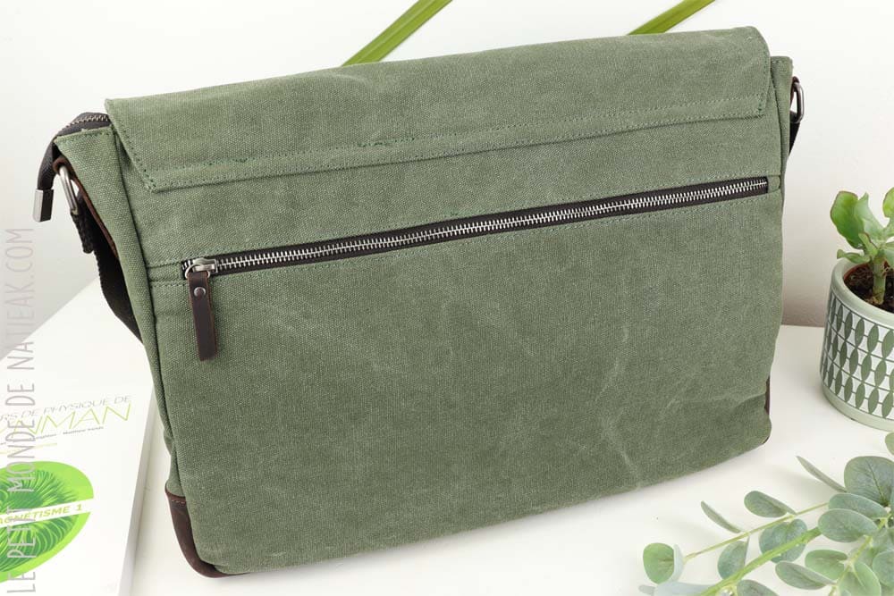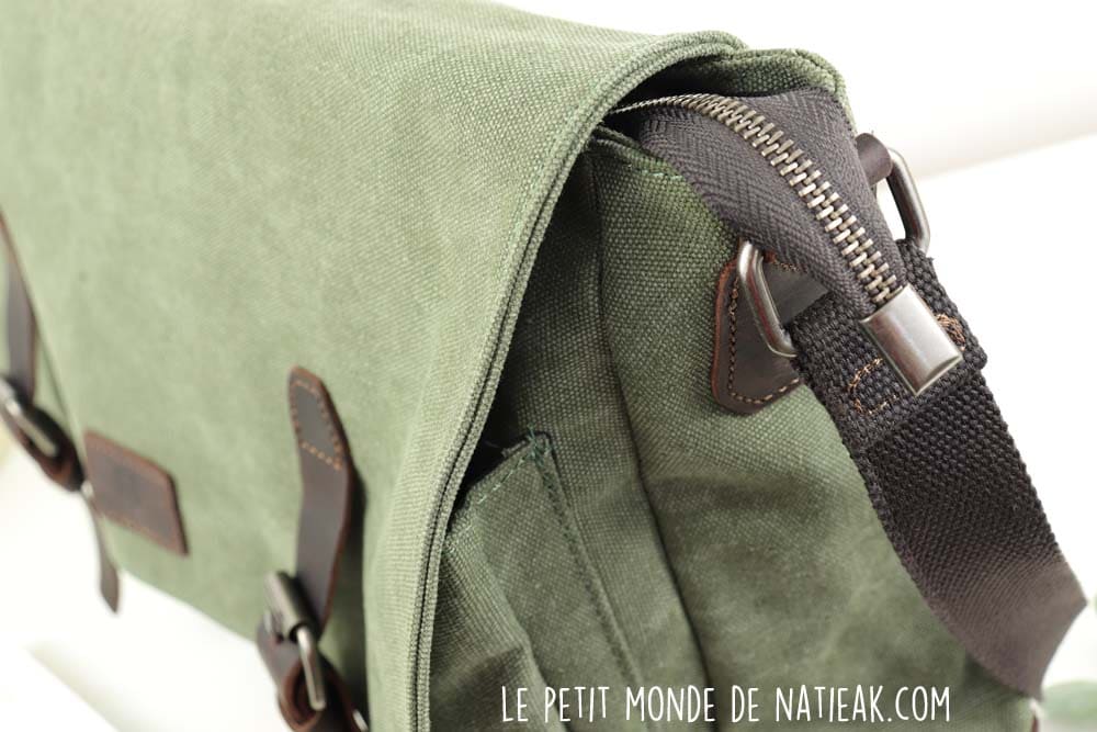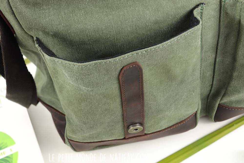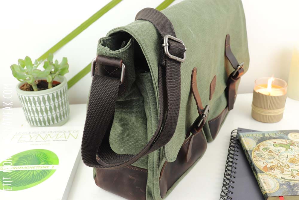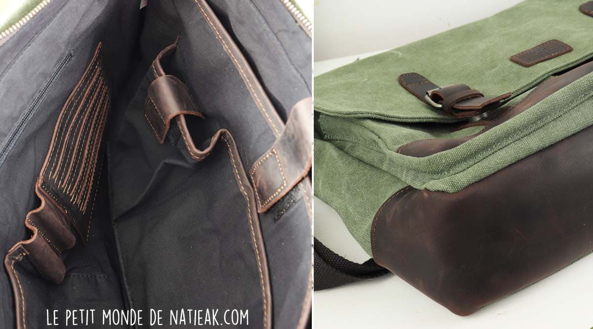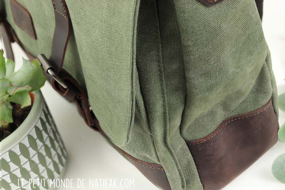 La toile résistante est associée au cuir de vachette qui permet de renforcer ce sac notamment sur sa base, le fond, ainsi qu’au niveau des lanières qui sont munies de bouton-pression. Il sera donc important de nourrir le cuir, afin de lui conserver sa souplesse. Cela ne demande ni beaucoup de temps, ni d’expertise.