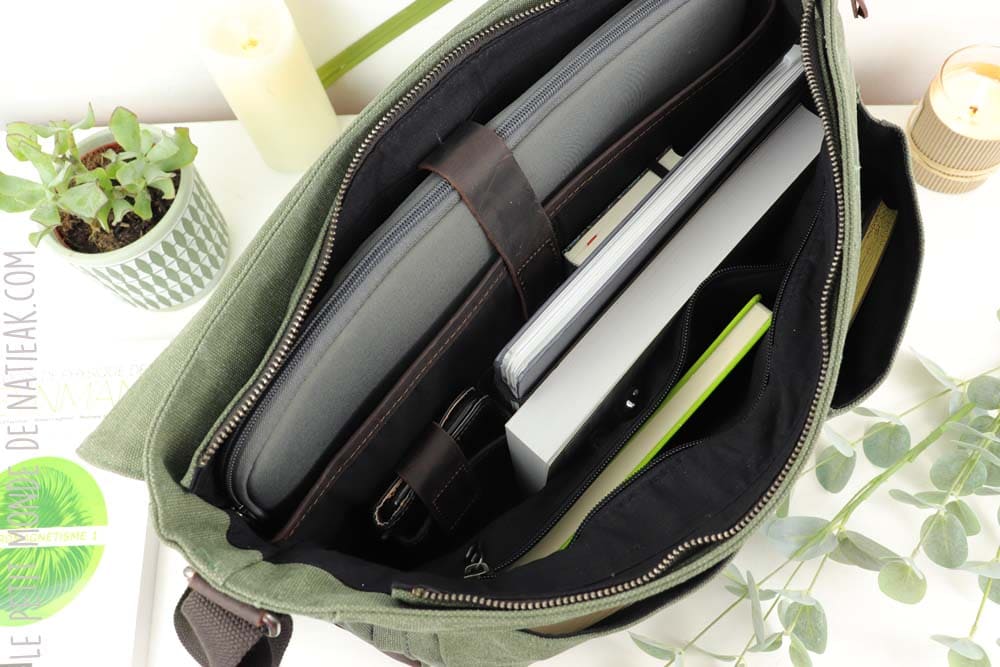 L’intérieur du sac, muni d’une doublure en coton, contient de nombreux rangements (cartes, stylos, téléphone) et d’autres compartiments plus spacieux dont l’une avec une fermeture Eclair. Le compartiment réservé à l’ordinateur est matelassé et doté d’une fermeture auto-aggrippante, afin d’assurer une bonne protection et un bon maintien du PC. Notons que ce sac peut être utilisé même si on ne possède pas d’ordinateur !