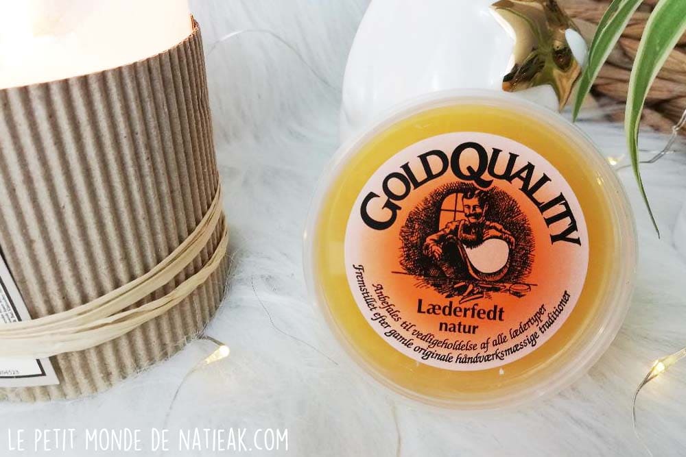 Pour l’entretien de ce sac pour ordinateur, j’ai choisi la graisse Gold Qualité, 100 % naturelle issue d’un savoir-faire danois réalisé selon une ancienne recette originale. C’est d’après les informations que j’ai trouvé, le meilleur produit d’entretien pour cuir du Danemark ! La graisse et la cire d’abeille vont permettre de conserver la douceur du cuir et sa souplesse, ainsi que sa résistance aux tâches et à l’eau. Je ne manquerai pas de vous mettre un édit d’ici quelques mois après utilisation.
