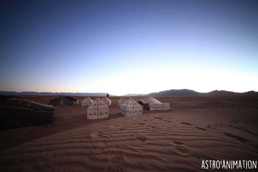 Il y avait peu de touristes en cette période de l’année : deux dont mon mari ! La nuit sous la tente non chauffée fut fraîche et d’autant plus que janvier est la période la plus froide de l’année à Zagora. Ceci étant, ce fut une expérience intéressante : le repas fut simple mais copieux et malgré la présence de pollution lumineuse au loin, le dépaysement est total.