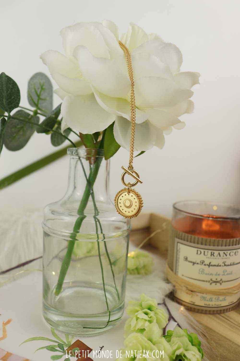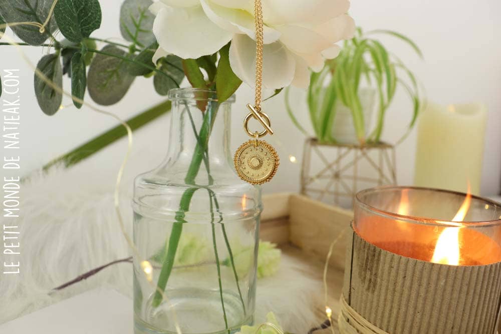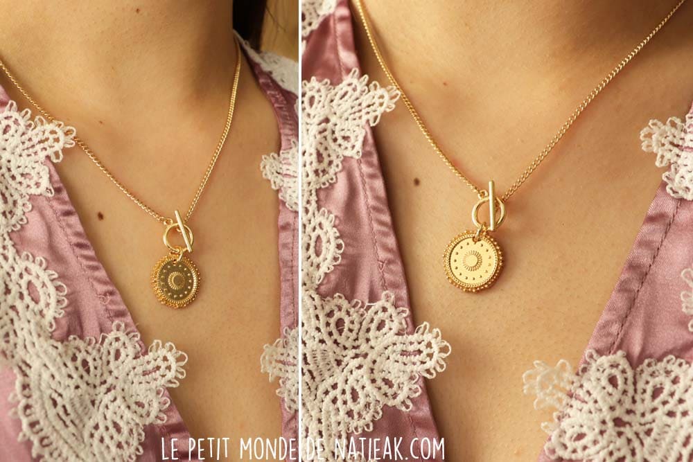 C’est un bijou tout en finesse qui habille avec féminité un haut dont l’encolure est en V. Ma fille a immédiatement adopté ce collier dont le style correspond à ses préférences. Dans le description, My Little box indique que le médaillon gardera un (troisième) œil avisé lors des séances de méditation.
