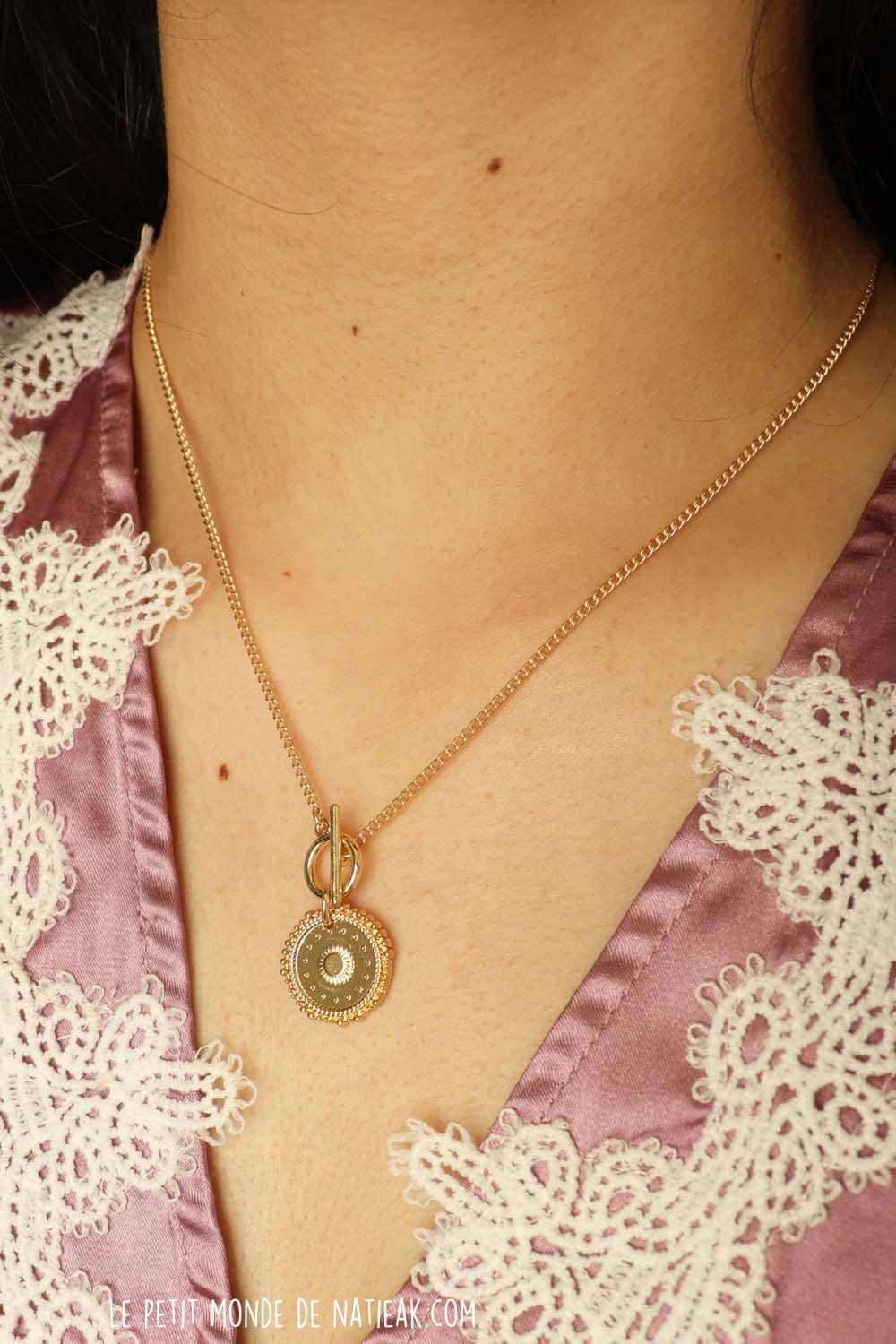 Ce collier doré est fabriqué en zamac recyclé issu d’un mélange de plusieurs métaux . La médaille, ornée de plusieurs gravures en relief, est maintenue par un plus grand anneau servant de fermoir Toggle. Il a l’avantage de pouvoir introduire le fermoir en T d’une seule main en faisant passer la petit barre dans l’orifice.