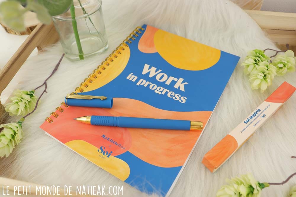 Partons à la découverte de la box de février : celle-ci contient un carnet Work in progress accompagné de son style belle plume sur le thème de la box de janvier 2022 : un contretemps de livraison n’avait pas permis de les recevoir le mois dernier. Ce grand carnet me sera très utile car je suis de la team Papier : j’aime écrire et noter toutes les idées qui me passent par la tête.