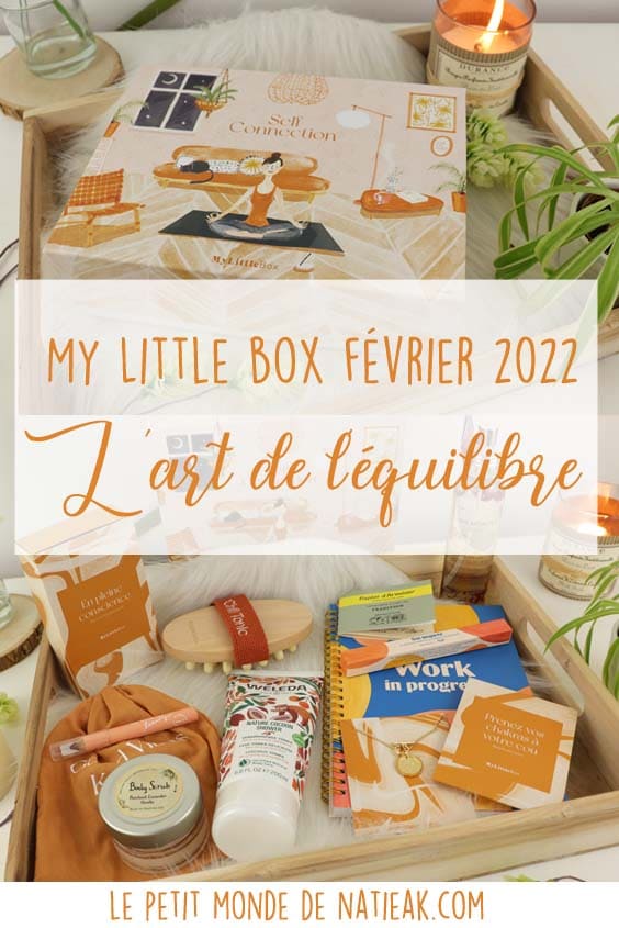 Pour le mois de février 2022, My Little box contient 9 produits autour du thème de l’Art de l’équilibre et du bien-être : Huile sublime bio de Cinq mondes (42 €), Brosse de massage En pleine conscience, Crème de douche Weleda (6,75 €), Crayon fard à paupières My Little beauty, un gommage pour le corps de Sabon format voyage (valeur 4,68 € en format 60 gr, vendu sur le site en 360 gr) un collier médaille sans revers, Papier d’Arménie (2,90 €), un pochon Good Vibes keeper (qui signifie gardien de bonnes vibrations) et un carnet agenda et son stylo (de la collection de janvier 2022).