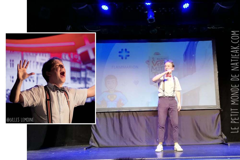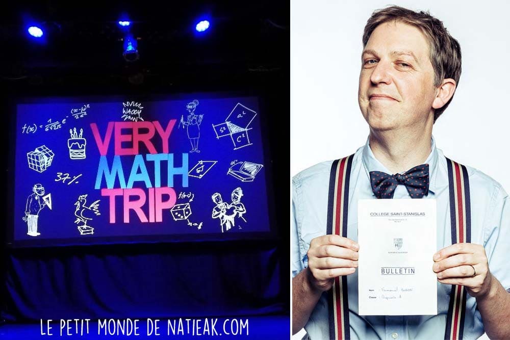 Cette fois, j’ai proposé à ma fille de découvrir Very Math Trip : un One Math Show familial (à partir de 10 ans environ), qui promet de nous réconcilier avec les mathématiques. On doit ce spectacle à Manu Houdart, un professeur de mathématique belge, passionné par cet art, qui fut pourtant loin d’être une matière où il excellait au vu de son bulletin de notes…