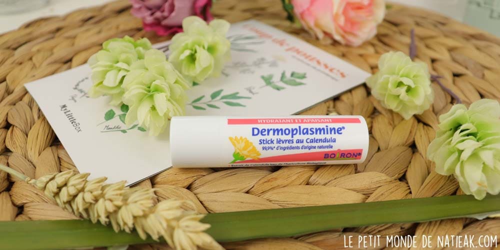 On termine avec le meilleur produit de cette box : le stick à lèvres Dermoplasmine des Laboratoires Boiron. Il est tout particulièrement destiné aux lèvres fragilisées et sensibles. Grâce à sa composition à 99,9 % naturellece soin au calendula va réhydrater, nourrir et apaiser les lèvres.