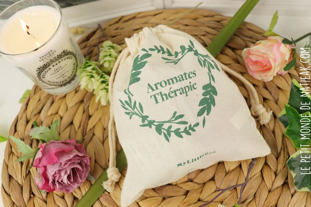 Poursuivons avec la routine beauté regroupée dans un pochon en tissu portant l’inscription Aromates Thérapie. À l’intérieur, nous découvrons 4 soins destinés au visage et cheveux.