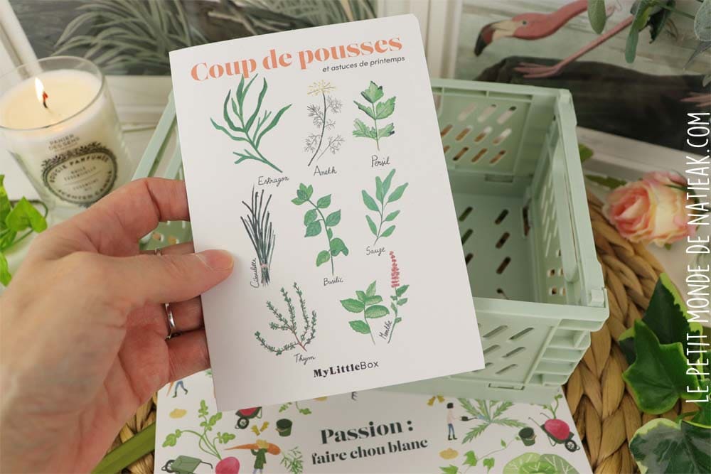 My little box nous soumets l’idée de la transformer en mini jardinière : l’idée est intéressante, si bien que cela aurait été plaisant de trouver dans cette sélection des sachets de graines : tomates cerises, herbes aromatiques…