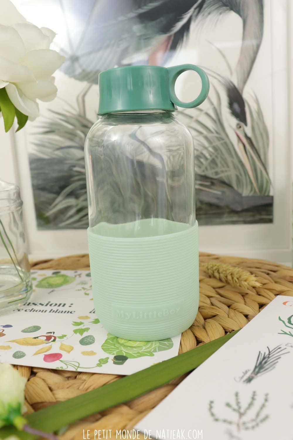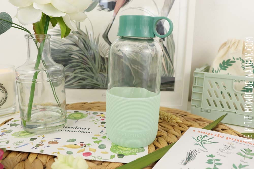 Poursuivons avec la gourde en verre d’une contenance de 300 ml, avec une protection en silicone à sa base et d’un capuchon en forme de tasse. Sa couleur vert d’eau reprend celle de la cagette, à l’image de la nature.