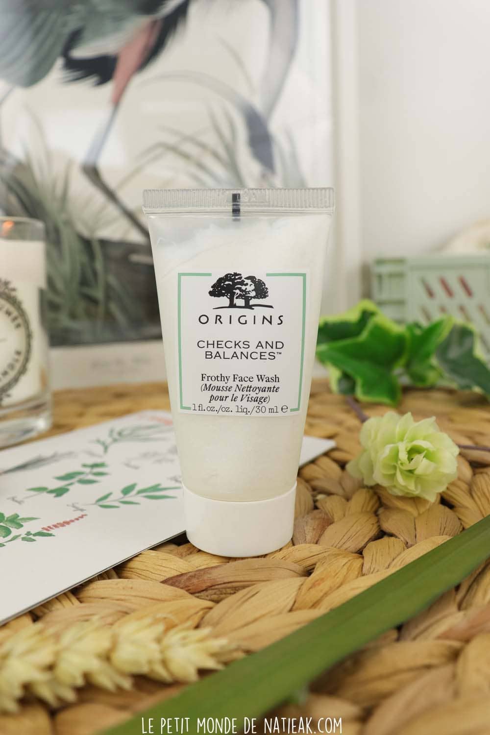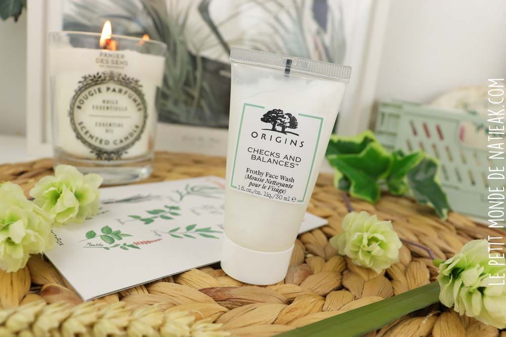 La routine beauté commence par l’échantillon gratuit de 30 ml de la mousse nettoyante  Origins, capable de rééquilibrer les zones grasses, tout en protégeant les zones sèches. À l’ouverture du flacon, je perçois immédiatement un parfum de menthe très frais que la marque a associé  à de la lavande et de bergamote.