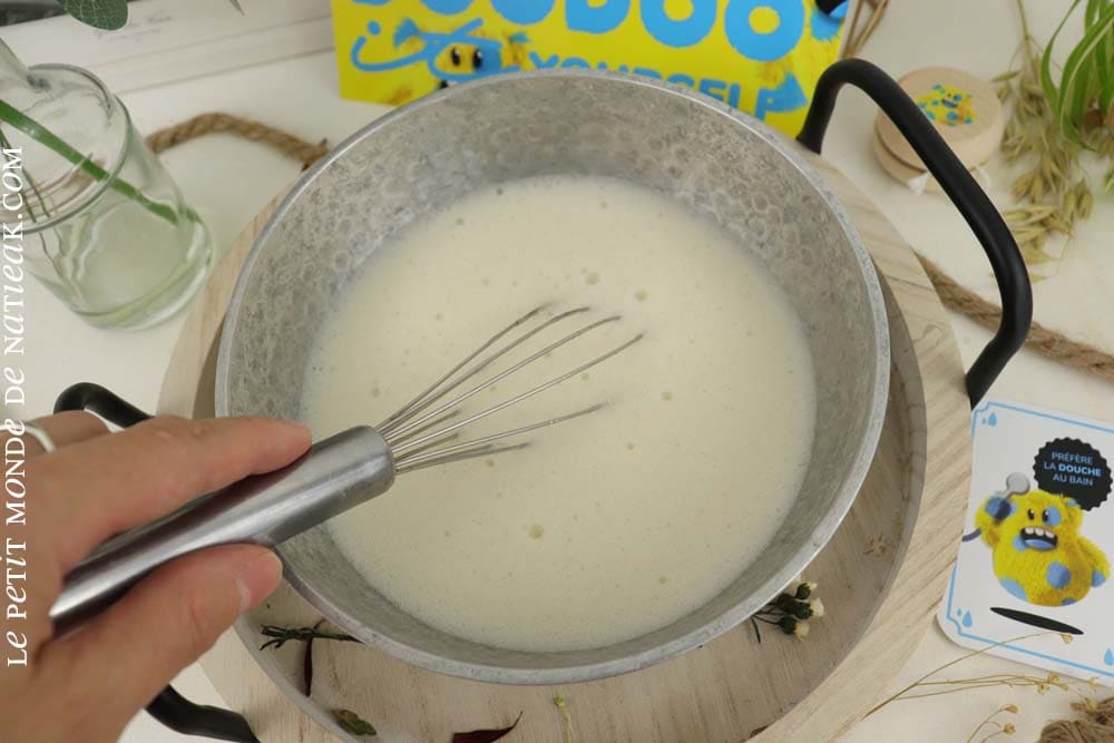Pour formuler le gel douche, l’enfant reçoit tous les ingrédients indispensables à sa réaliser. Pour mélanger la recette, on aura besoin d’accessoires de cuisine basique : un grand bol, un récipient à mesure, une cuillère ou un fouet et un contenant à bec verseur pour transférer la recette dans le flacon.