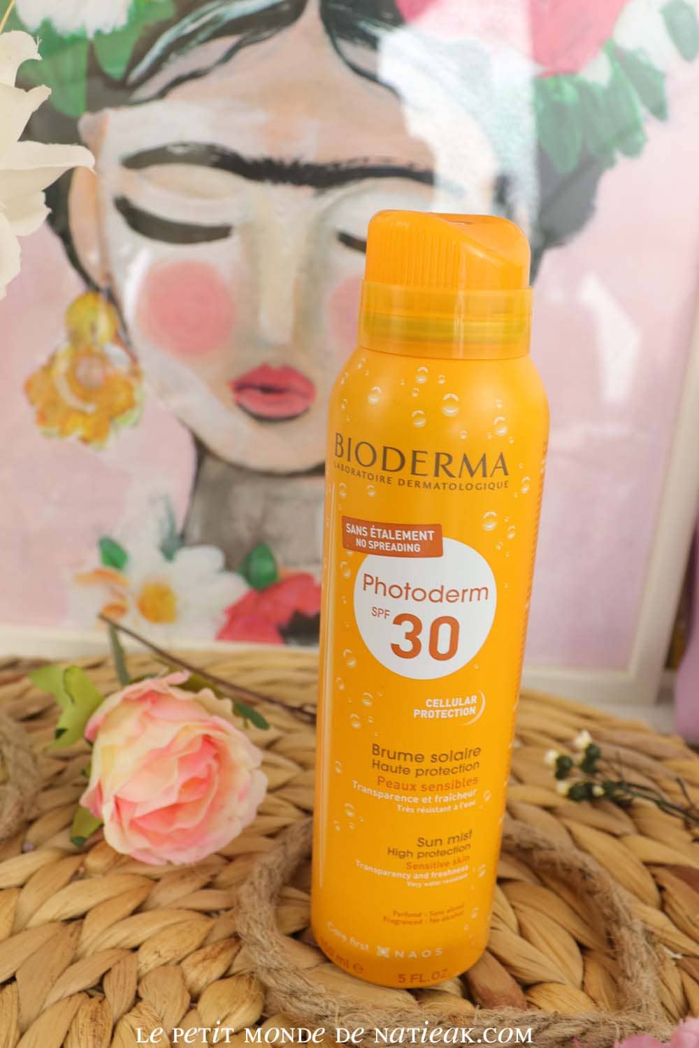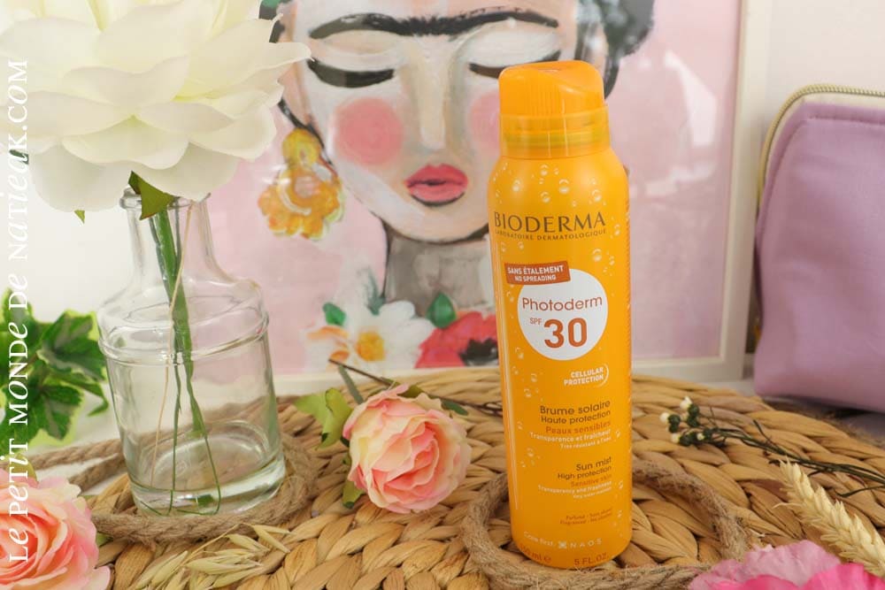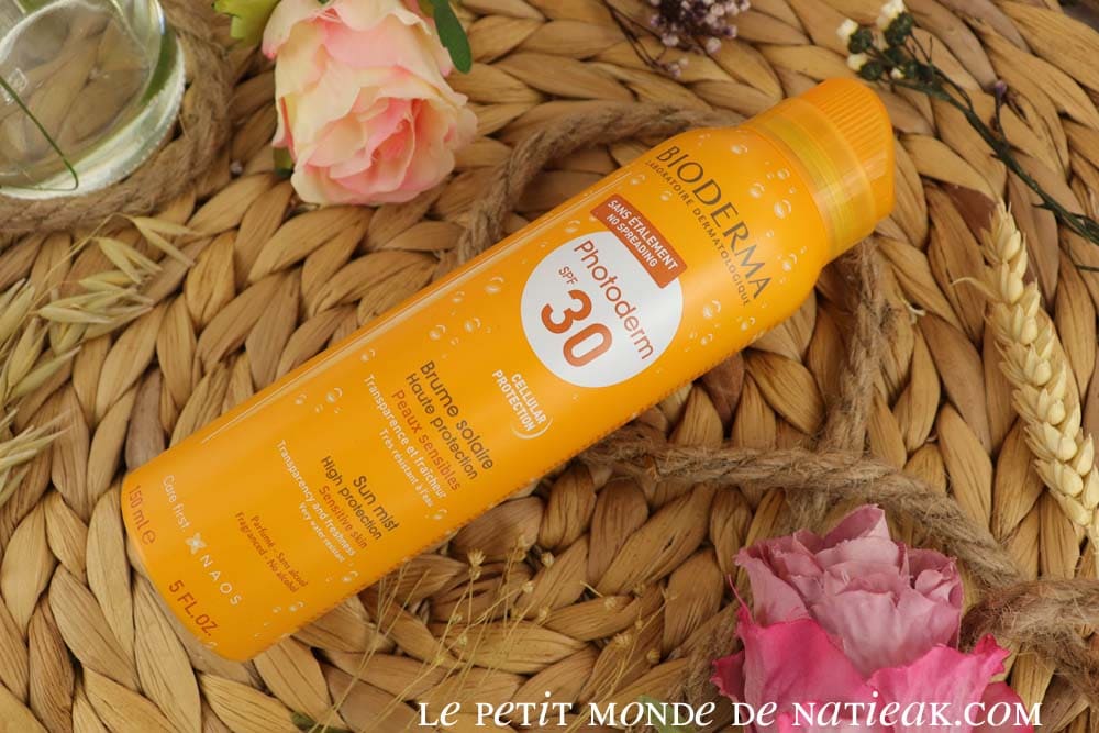 On termine avec la brume solaire pour peaux sensibles Photoderm de Bioderma en SPF 30. La marque signale qu’on n’a pas besoin d’étaler la brume : il suffit juste de vaporiser la brume sur la peau.